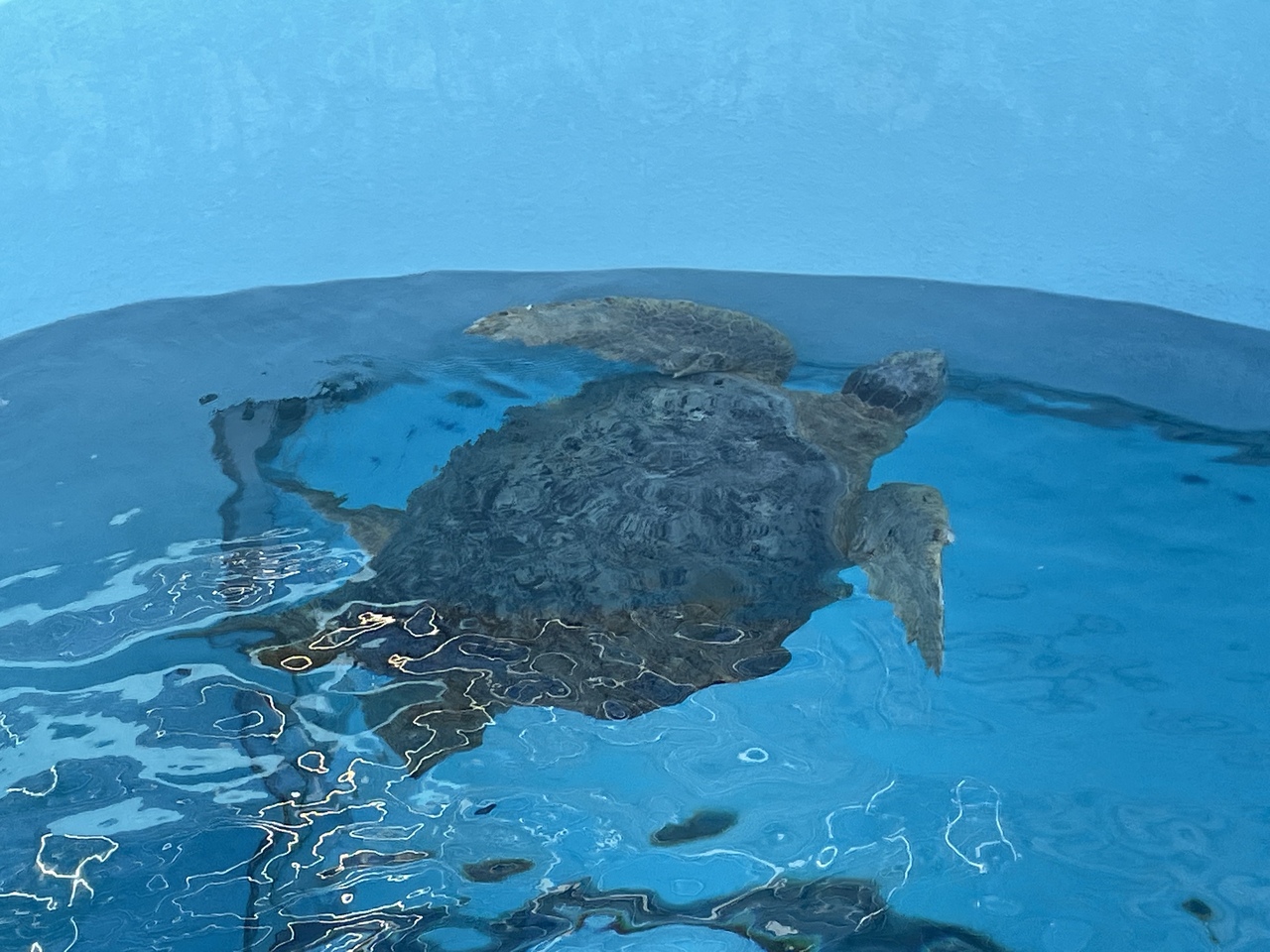 美ら海水族館の向かい、海側にある無料のウミガメ観察エリアです。屋外では上からのぞきこむように、地下観覧室の館内からは水槽を優雅に泳ぐたくさんのウミガメたちを観察することができます。産卵用の砂場もありました。