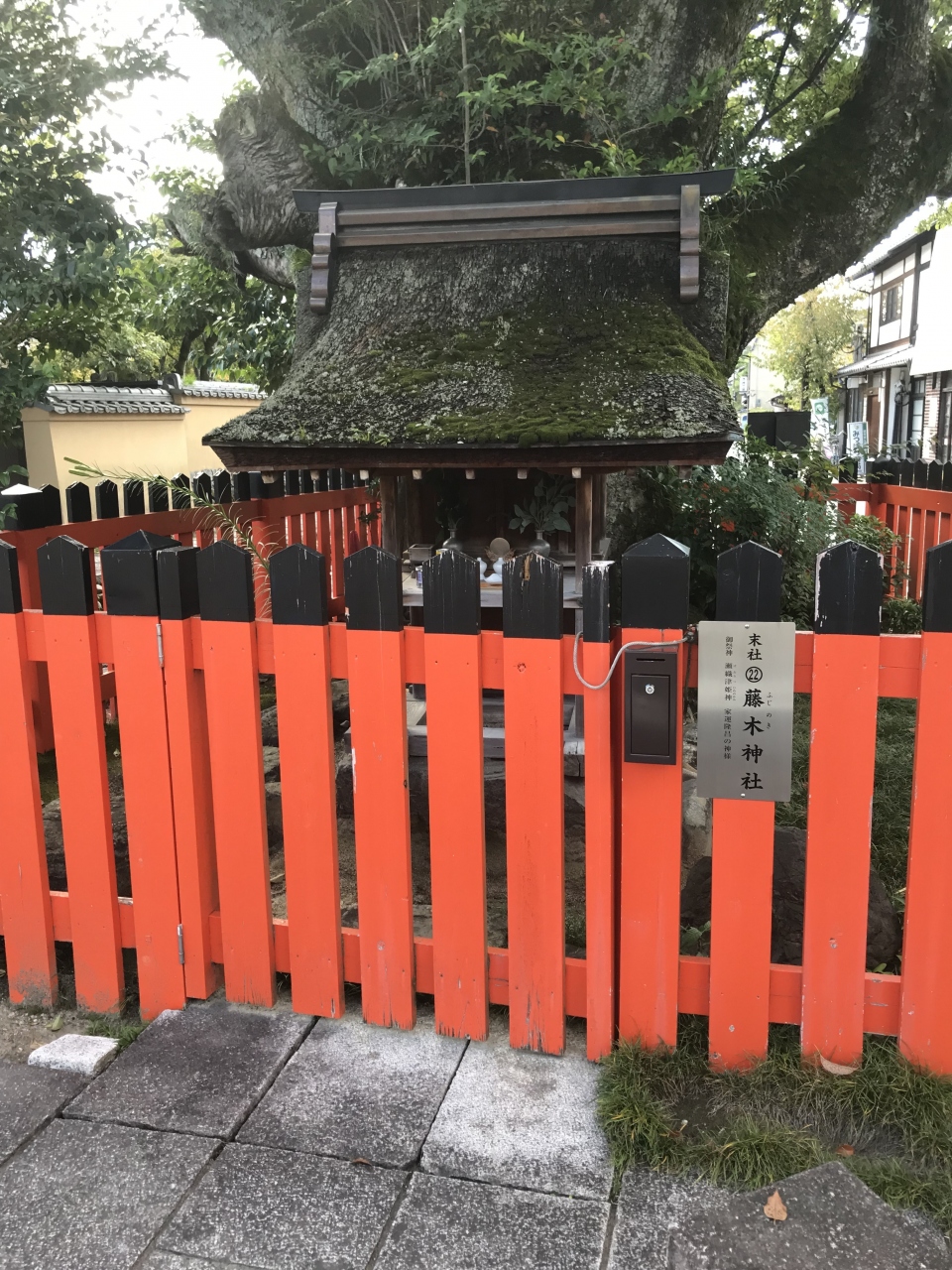 藤木社は、上賀茂神社から神官たちが社家を構えた明神川に沿って、大田神社方向へ徒歩5分ほど行ったところにあります。藤木社は明神川のほとりにあり、明神川の守護神として祀られています。葵祭には南大路町の氏子により神輿渡御が行われています。社の横にある楠は樹齢500年と推定され、地元のシンボルとして崇められています。