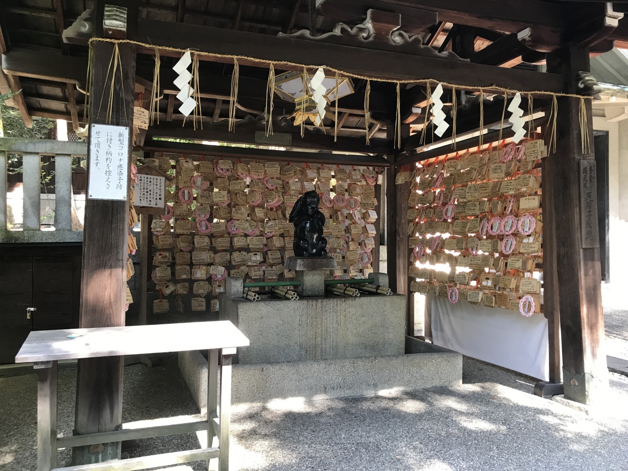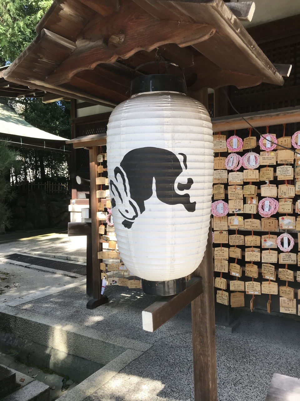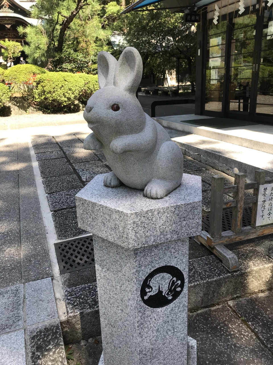 岡崎神社は、丸太町通沿いにある神社で、京阪電車の神宮丸太町駅からも比較的アクセスしやすい神社です。境内のあちらこちらにウサギの石像が存在し、インスタ映えする神社の一つとなっています。子授け、安産の神様ということで、カップルの参拝客が多かったです。境内の手水舎には黒御影の可愛らしいうさぎの像があり、そのうさぎに水をかけると子供が授かると信仰されています。