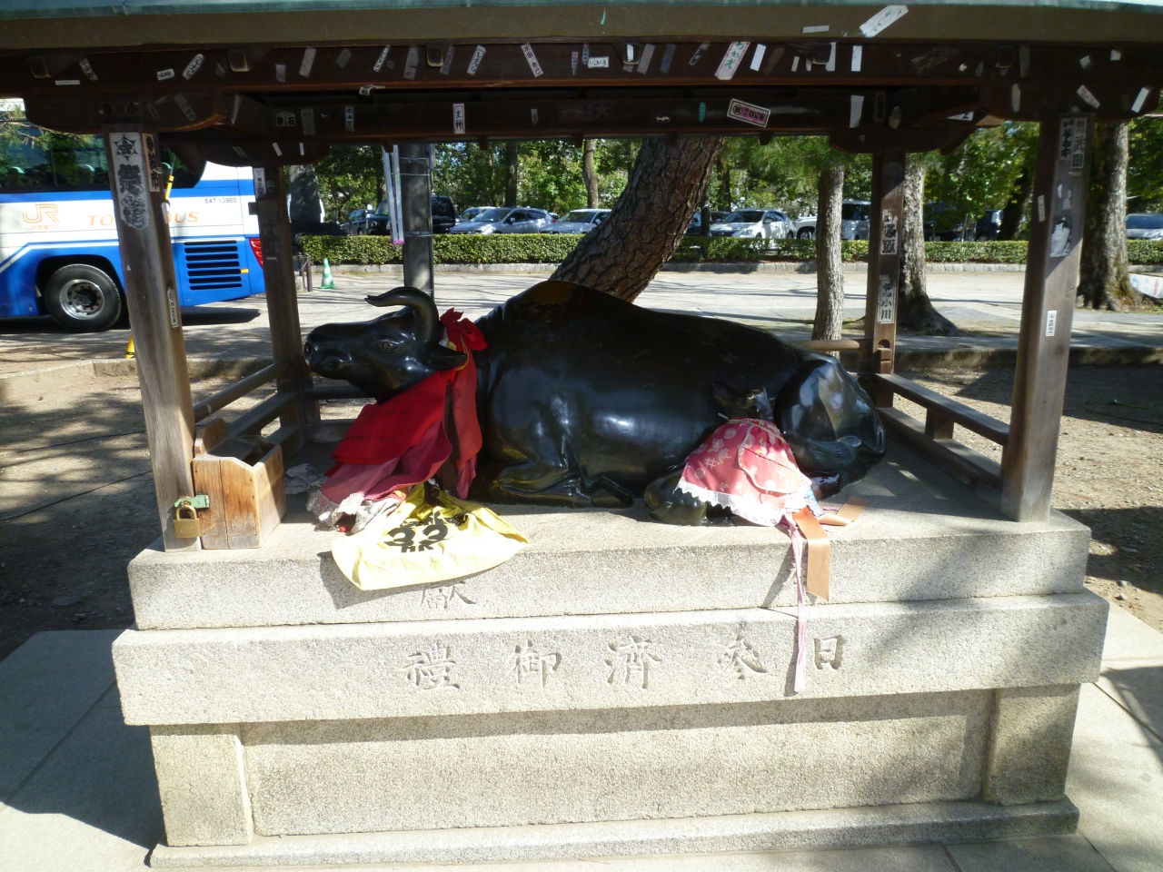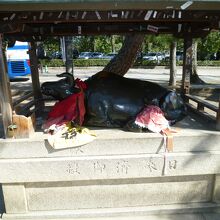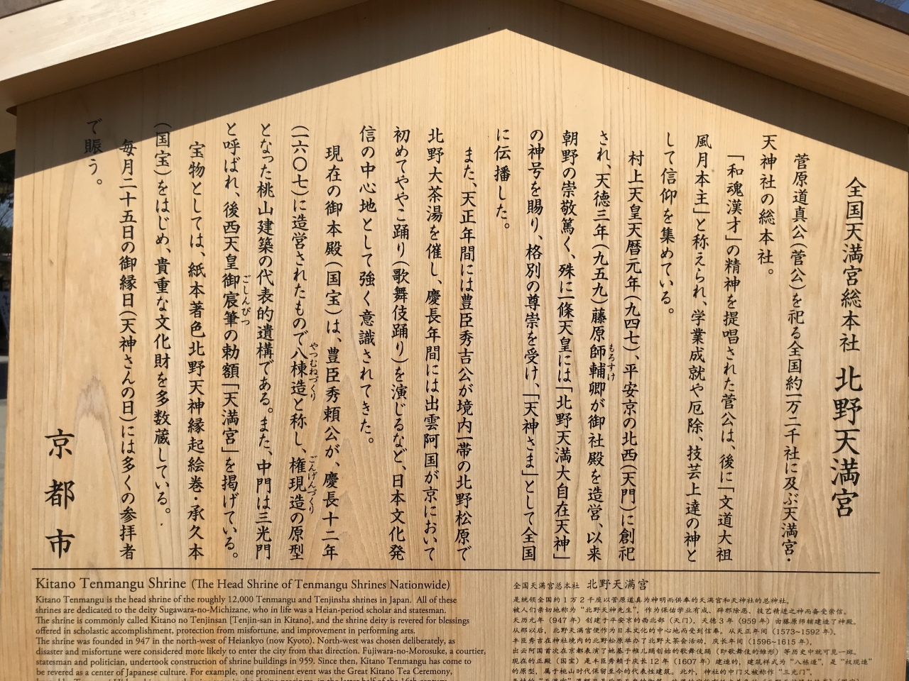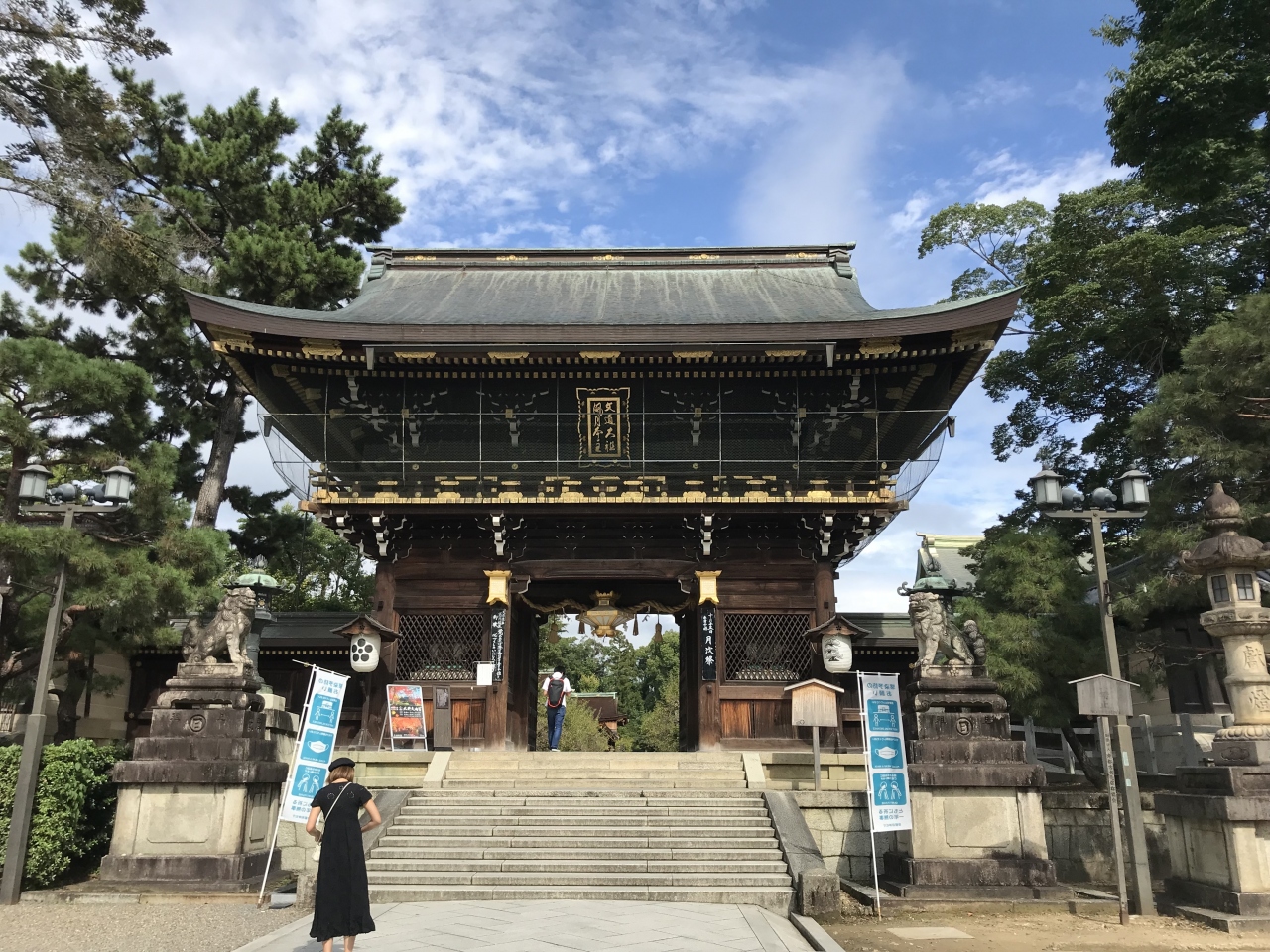 北野天満宮は、上京区北野馬喰町で、今出川通に面する鳥居があります。鳥居奥には参拝者用の駐車場が用意されているので参拝しやすい神社です。国宝の本殿・拝殿は桃山文化を代表する建築で、とても見ごたえを感じられます。境内にはたくさんの撫で牛の像がありますが、どの撫で牛もよく撫でられているせいで艶がよかったです。