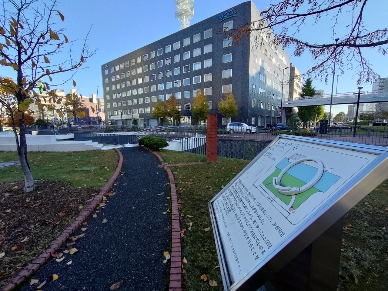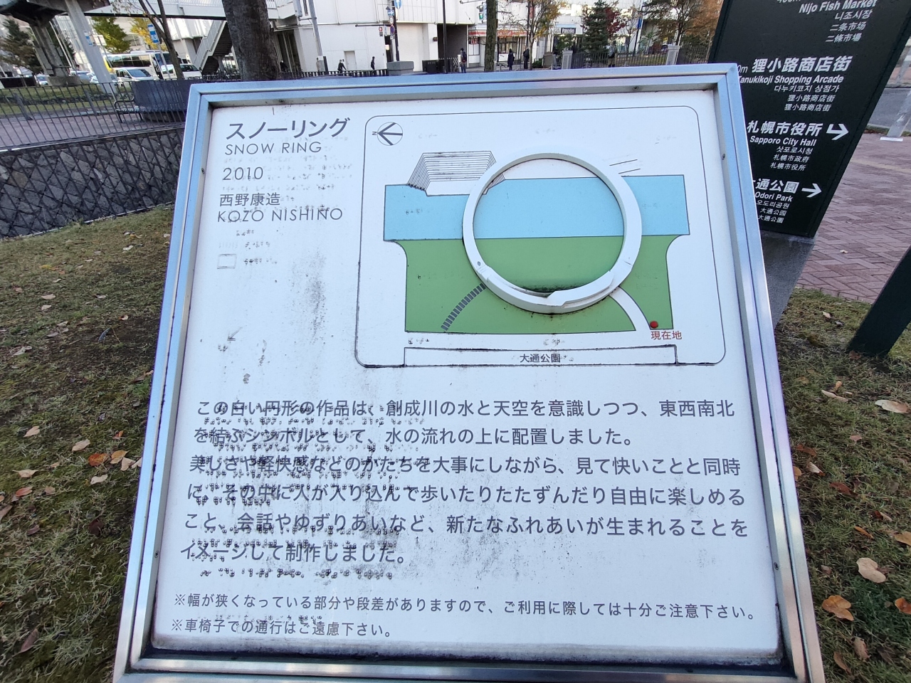 さっぽろテレビ塔裏の創成川沿い創成川公園の中のアート造形物の一つで、スノーリングは川に架かる橋として実用的に楽しむことができます。