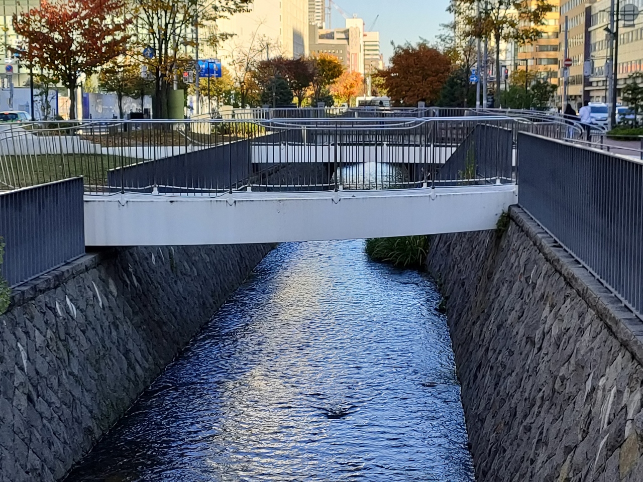 付近は親水公園として、橋上もしくは川面に降りるなどして川面の様子を眺めることができます。