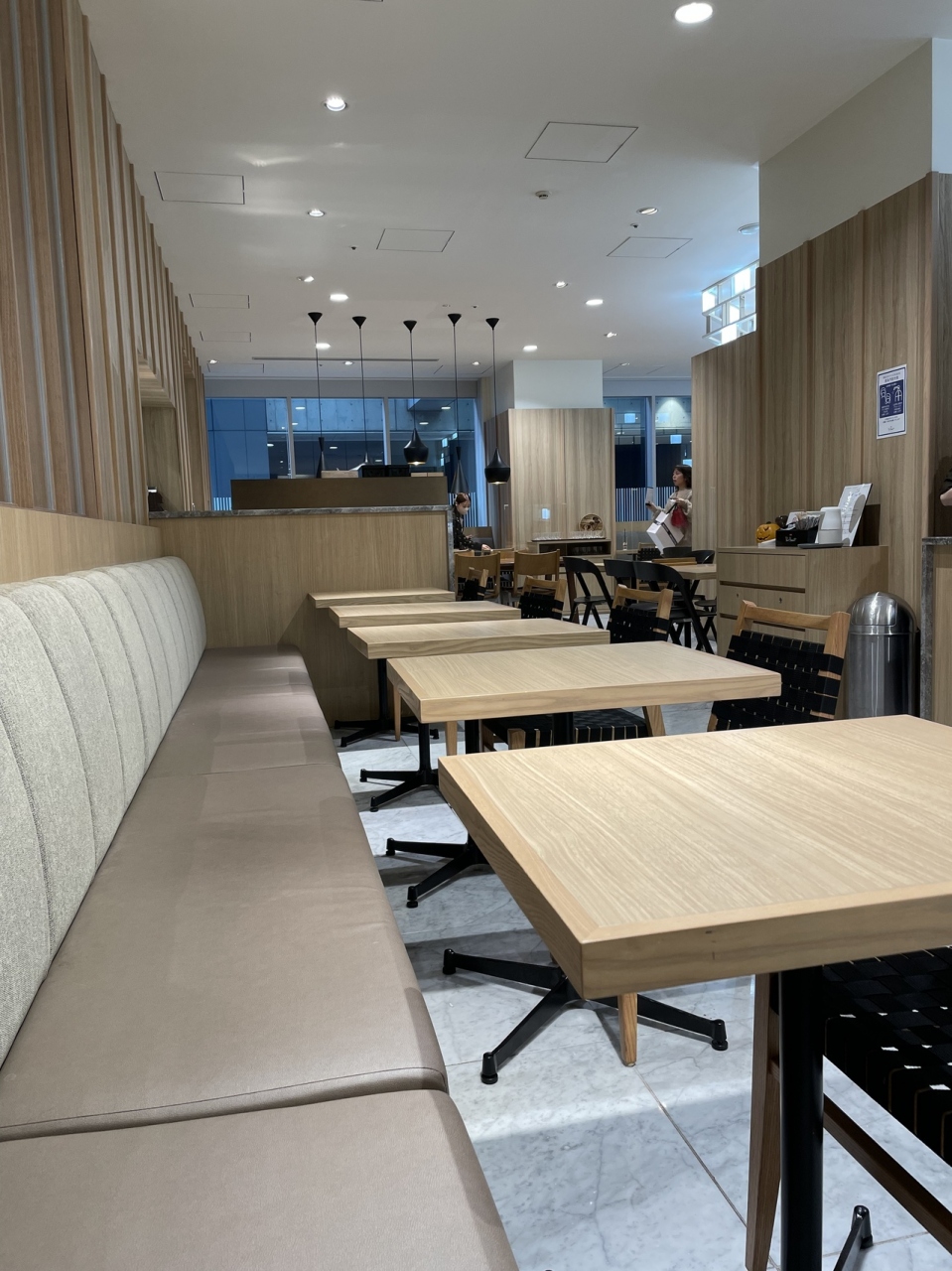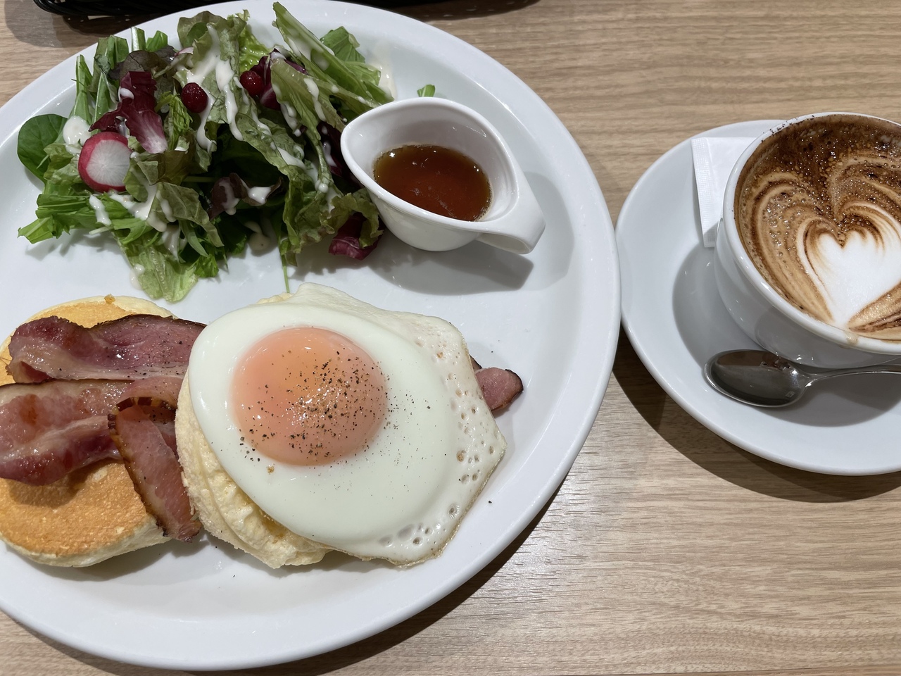 表面以外はほぼ泡のふわふわです。上に乗っている目玉焼きと一緒にナイフで切るとパンケーキが消え失せるほどです。パンケーキ自体にも少し甘味があります。カプチーノも美味しかったです。