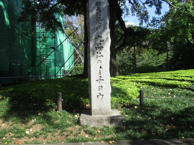 東急東横線自由が丘駅から東急大井町線に乗り換え九品仏駅に降りたら長い参道を進んで総門をくぐって広い境内の中に入って進んで行くと本堂の前に立派なイチョウの樹がありました。境内はとても広くたくさんの巨木がありましたがイチョウの木が特に大きかったです。幹の太さは大人4~5人が手をつないでやっと囲むことができるほどで高さは30mほどあると思われます。東京都の天然記念物に指定されてます。