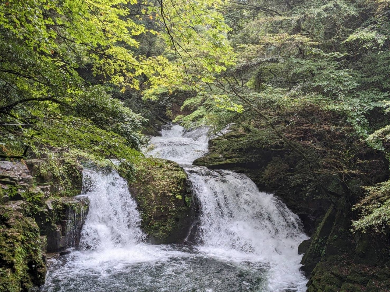 紅葉が見事と有名ですが、早い時期に行きました。暑くもなく、寒くもなく、緑と滝のシャワーで爽快感でした。