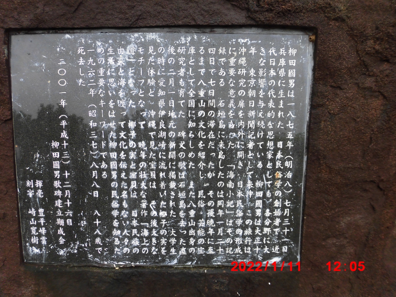 石垣島観光で立ち寄りました。八重山の文化を紹介した有名な民俗学者「柳田國男」の歌碑は、白保海岸にありました。最初、場所が分からなくて、白保海岸を歩いている時に、小さな案内板を見つけて、やっと着きました。柳田國男の年表に石垣島訪問が書かれてないのは、学生時代に石垣島に7日間滞在しただけだかららしいですが、詳細は不明でした。