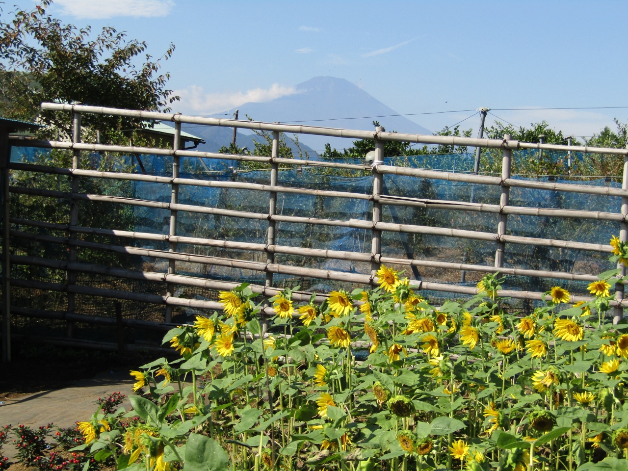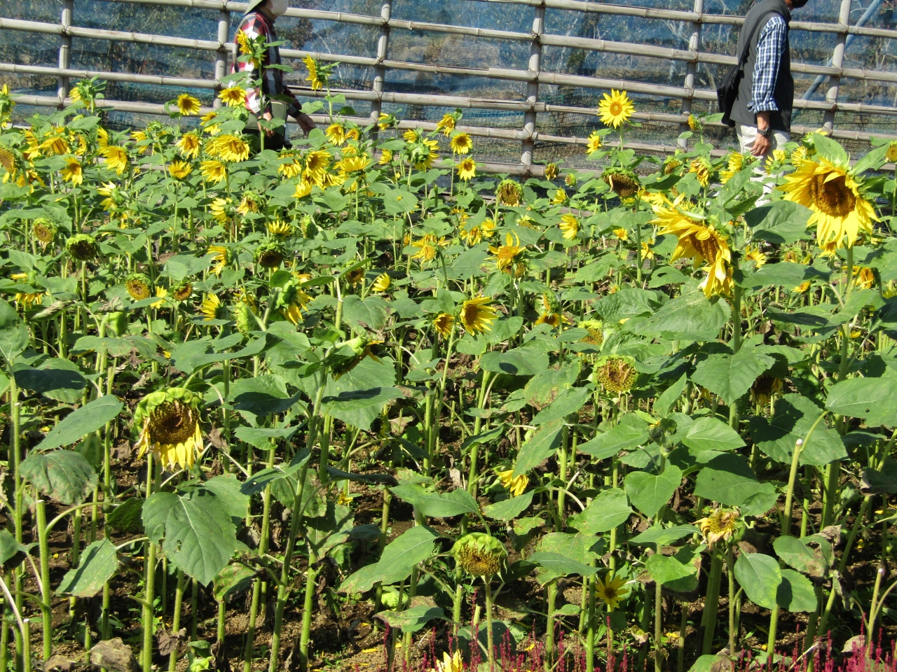 「コキアの里」は国営ひたち海浜公園の広大なコキア畑などとは比べるべくもない、ミニガーデンではあるが、その狭いガーデンの一角にはこれまた狭いヒマワリ畑もあり、秋に開花して見頃となっていた。そのバックには富士山が望める。