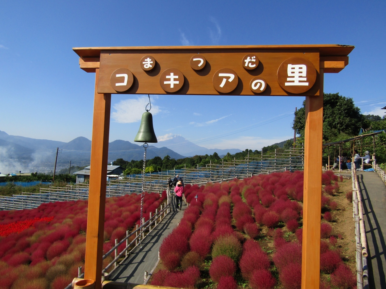 コキアの株は3000株と言われている。少ない数であるが、富士山を背景に、「コキアの里」の門や「コキアの鐘」の枠を額縁にして富士山を借景とした赤く染まったコキアを切り取ることが出来る。