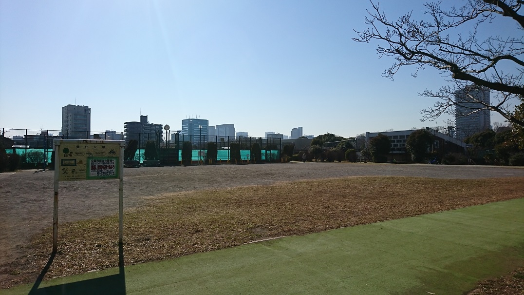 東京メトロ東西線木場駅から徒歩15分程度、江東区東陽6丁目の木場公園の東隣にある公園です。テニスコートや多目的広場、林の中の散策路、子供向けの遊具と、小規模ながらも一通りの施設が整っている公園です。散策路が人工芝になっていて、ちょっと趣に欠けていました。
