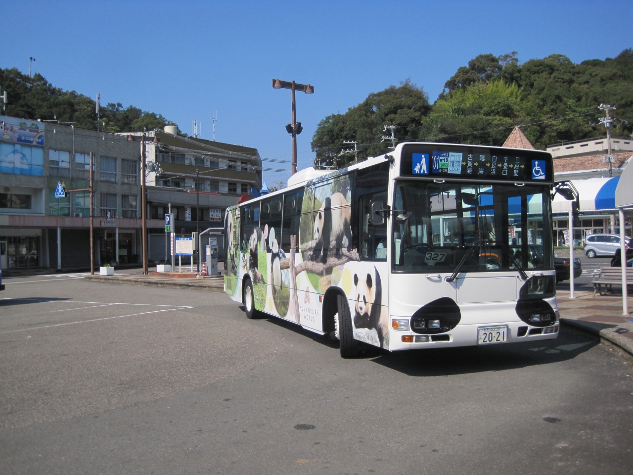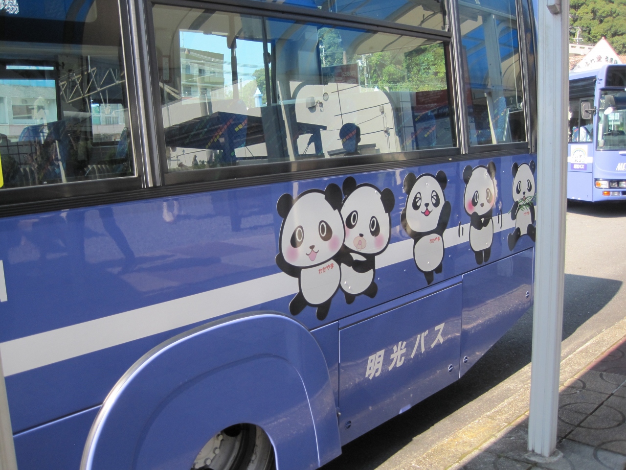 白浜駅からアドベンチャーワールドまで乗車しました、片道300円で、駅で切符が買えるので往復分買っておくと便利です。日曜日だったので、臨時の便が出ていて、コインロッカー隣のチケット売り場でアドベンチャーワールド入園券も買えるので、車掌さんに聞いたら、待っていてくれました。行きは普通のバスでしたが、帰りはパンダのラッピングバス、中もパンダだらけです!