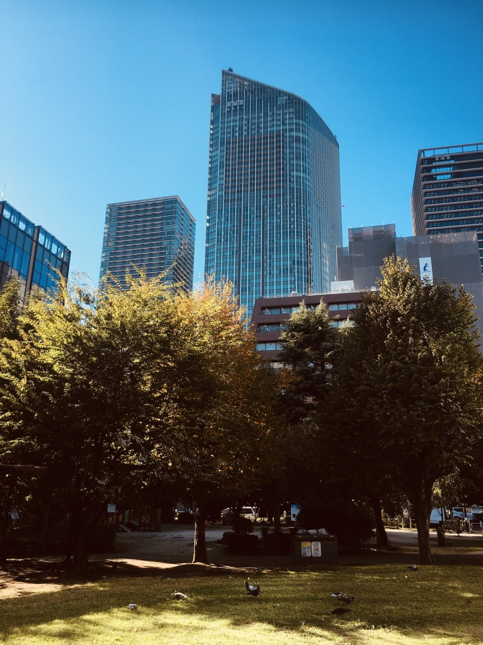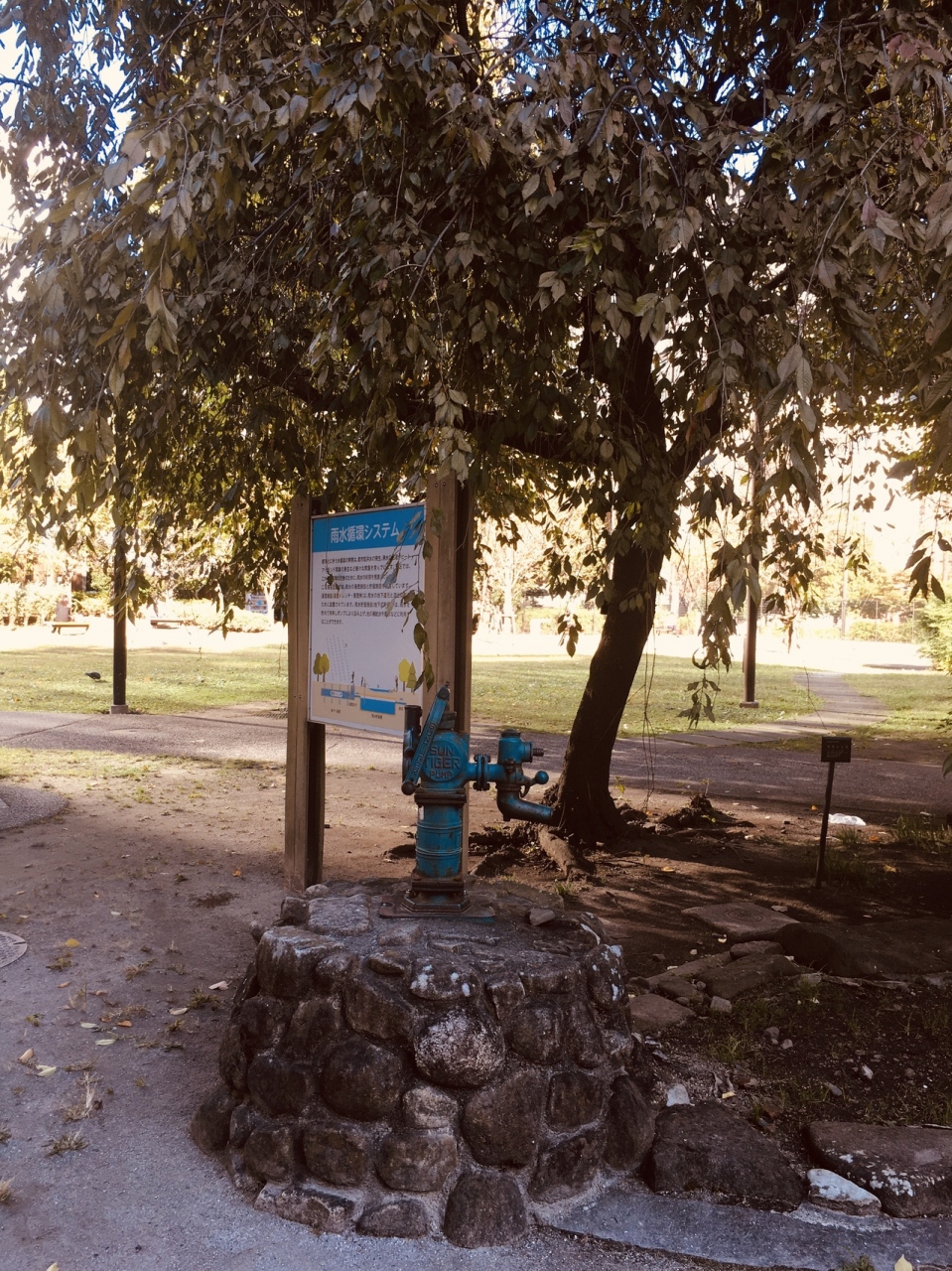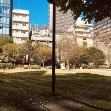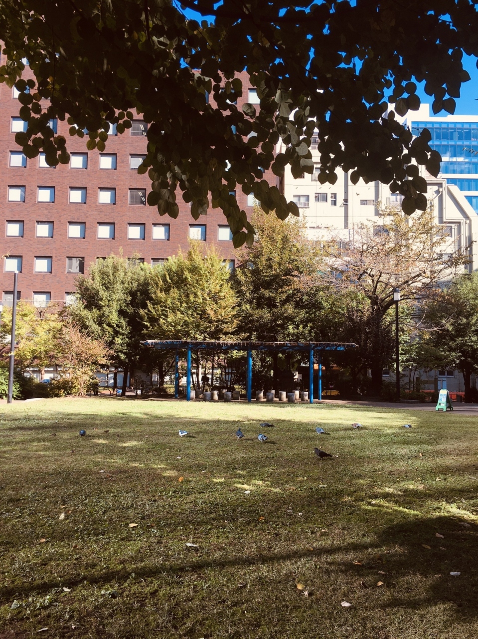 ビルに挟まれた公園で敷地の半分は芝生で、他は防火設備等があり、井戸、仮説トイレ等があり、子どもの遊戯施設もあって、ベンチもあるので繕いでいるひとが何人かいました。木々も植わっていて、野鳥の森と言う名前でしたが鳥を見ることは出来ませんでした。