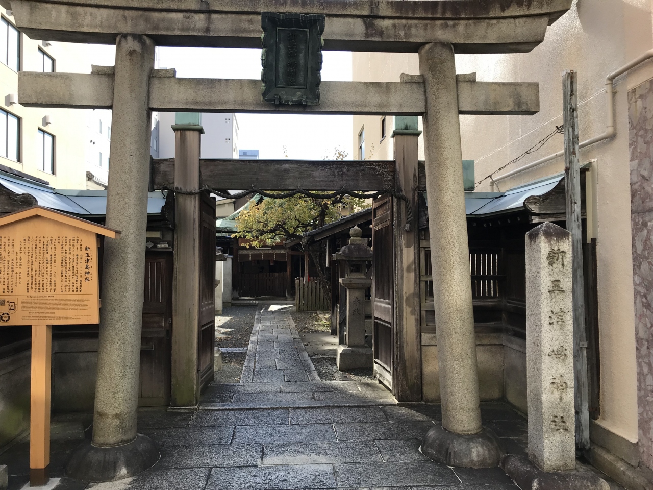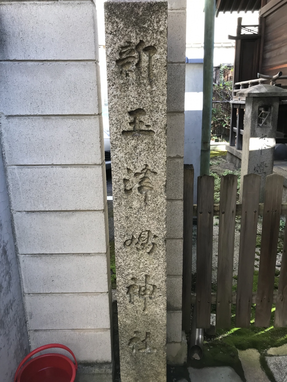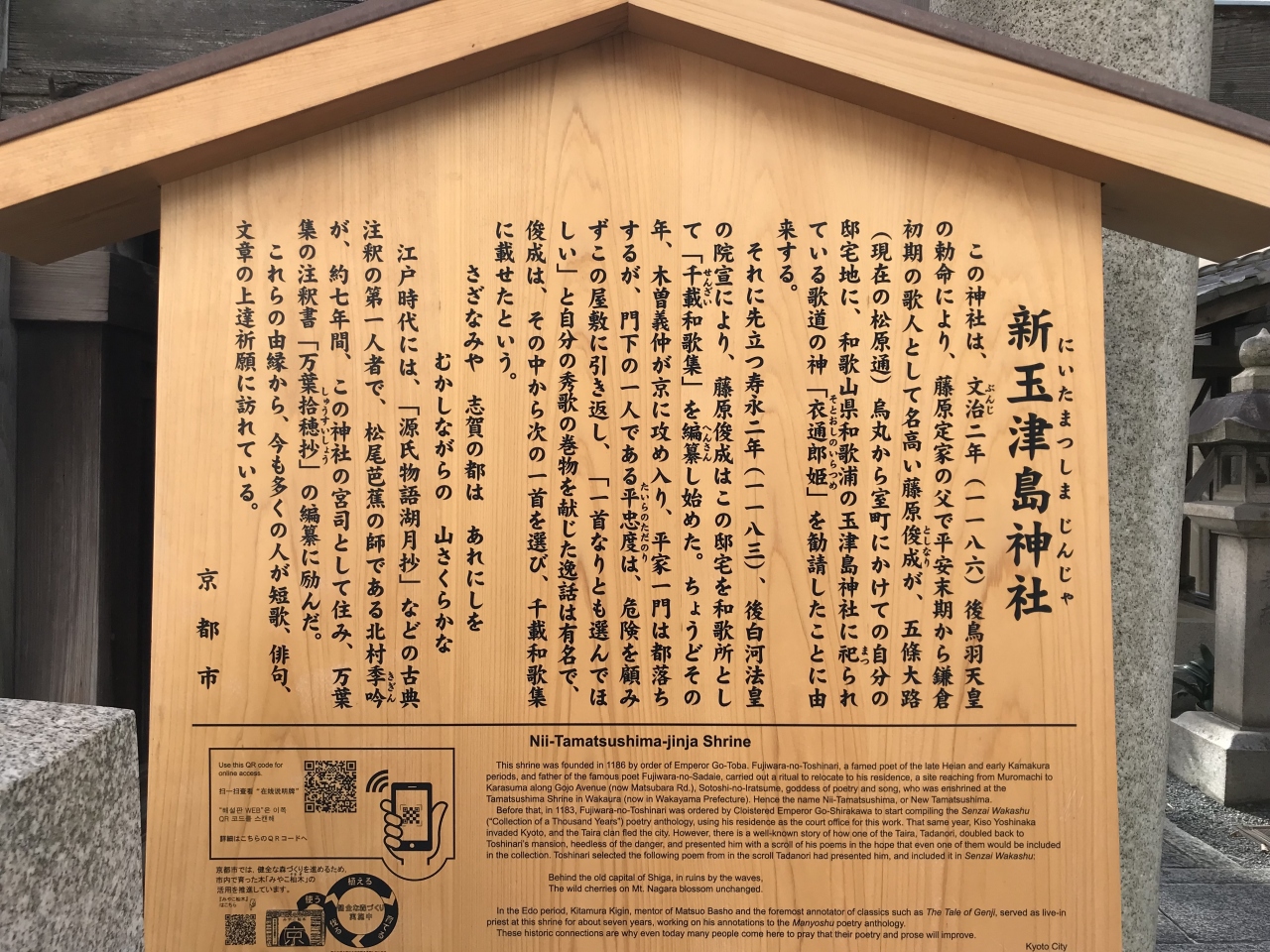 新玉津島神社は、地下鉄「四条」を南へ徒歩3分くらい行った場所にあります。鳥居脇には駒札が立っていて、神社の由緒が書いてありました。この神社は、文治2年(1186)後鳥羽天皇の勅命により、藤原俊成の邸宅地に、和歌山県和歌浦の玉津島神社を勧請したことに由来しています。小さな神社で、私が参拝した時には誰もいなく、ややさみしい感じがする神社でした。