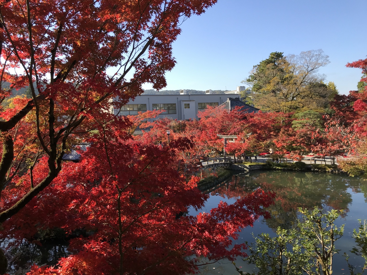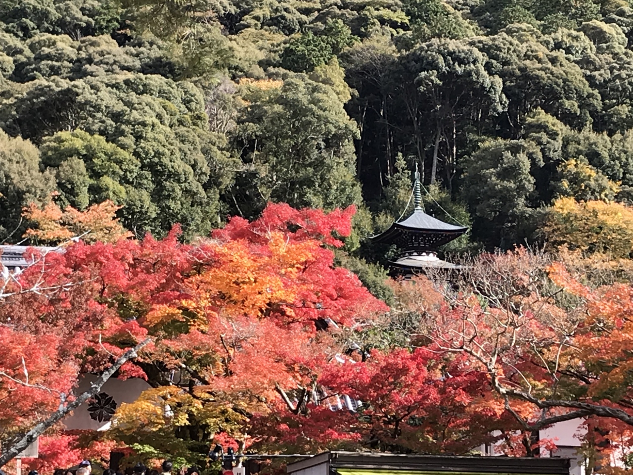 永観堂は、南禅寺から北へ行った永観堂町にある浄土宗西山禅林寺派の寺院です。秋は紅葉の名所として知られ、古来より「秋は紅葉の永観堂」と言われてきました。広い境内は、ほとんどの木々がもみじで壮観です。それが赤く染まっているので、紅葉に見事さに圧倒されてしまいます。多宝塔から見下ろした紅葉も絶景でした。一部イチョウと紅葉のコントラストを楽しめる場所もあり、とてもよかったです。