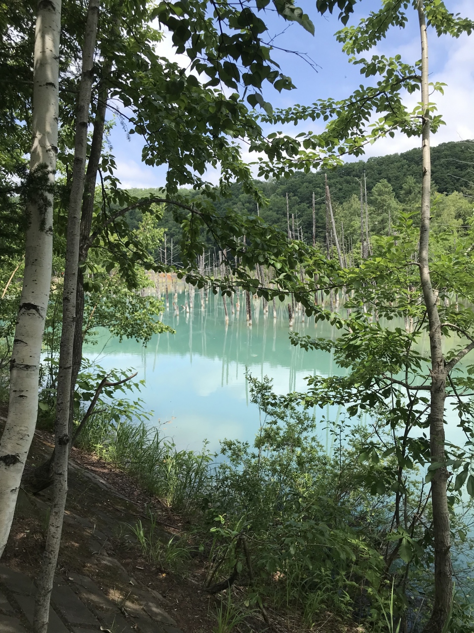そぞろ歩きに良い一歩通行の道の横に広がるブルーの池。やっぱり晴れてほしいですね