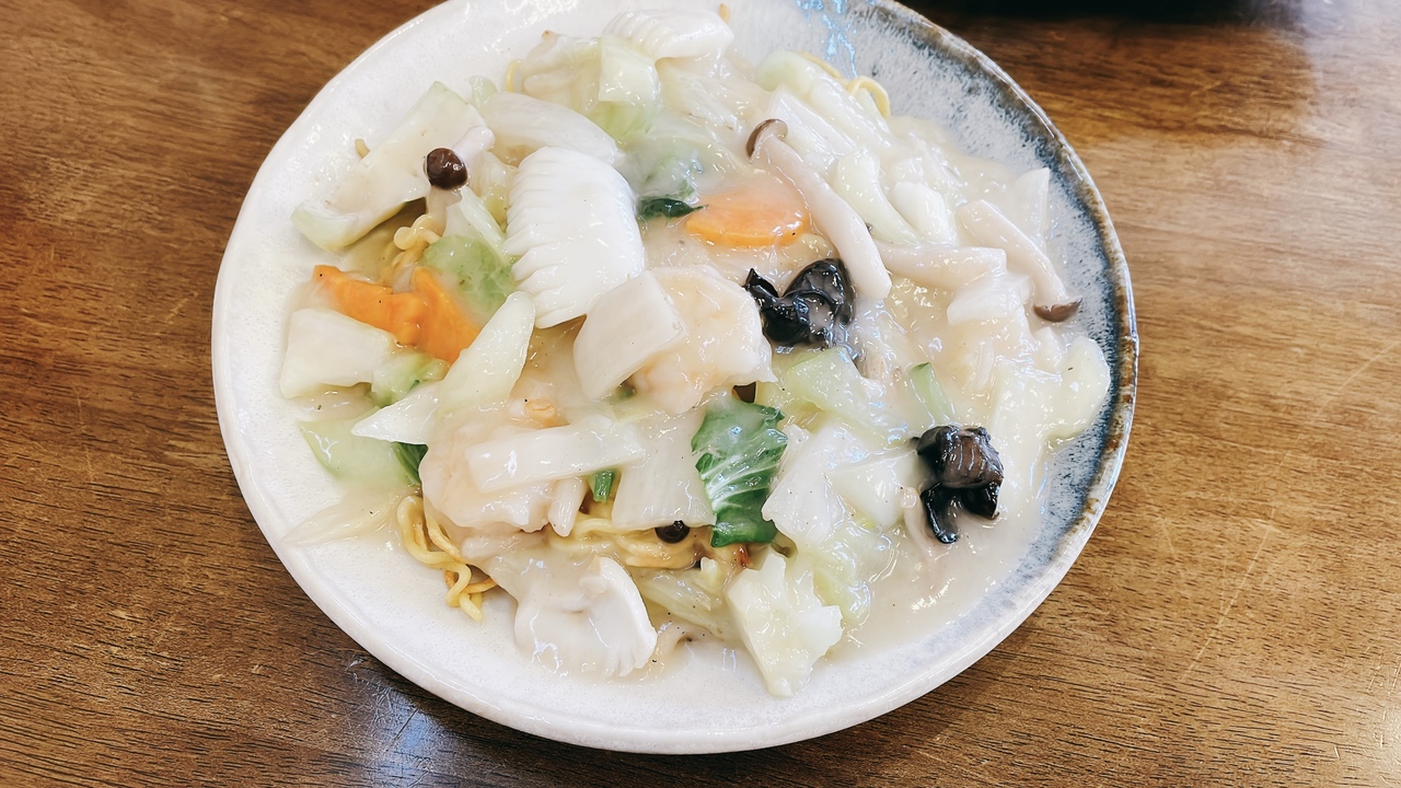 五目塩海鮮あんかけ焼きそばは塩加減が強くなくてエビやイカが大きくて良かったです。