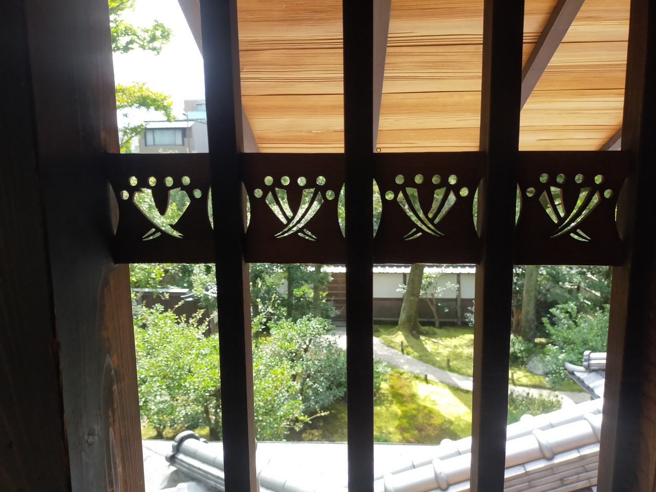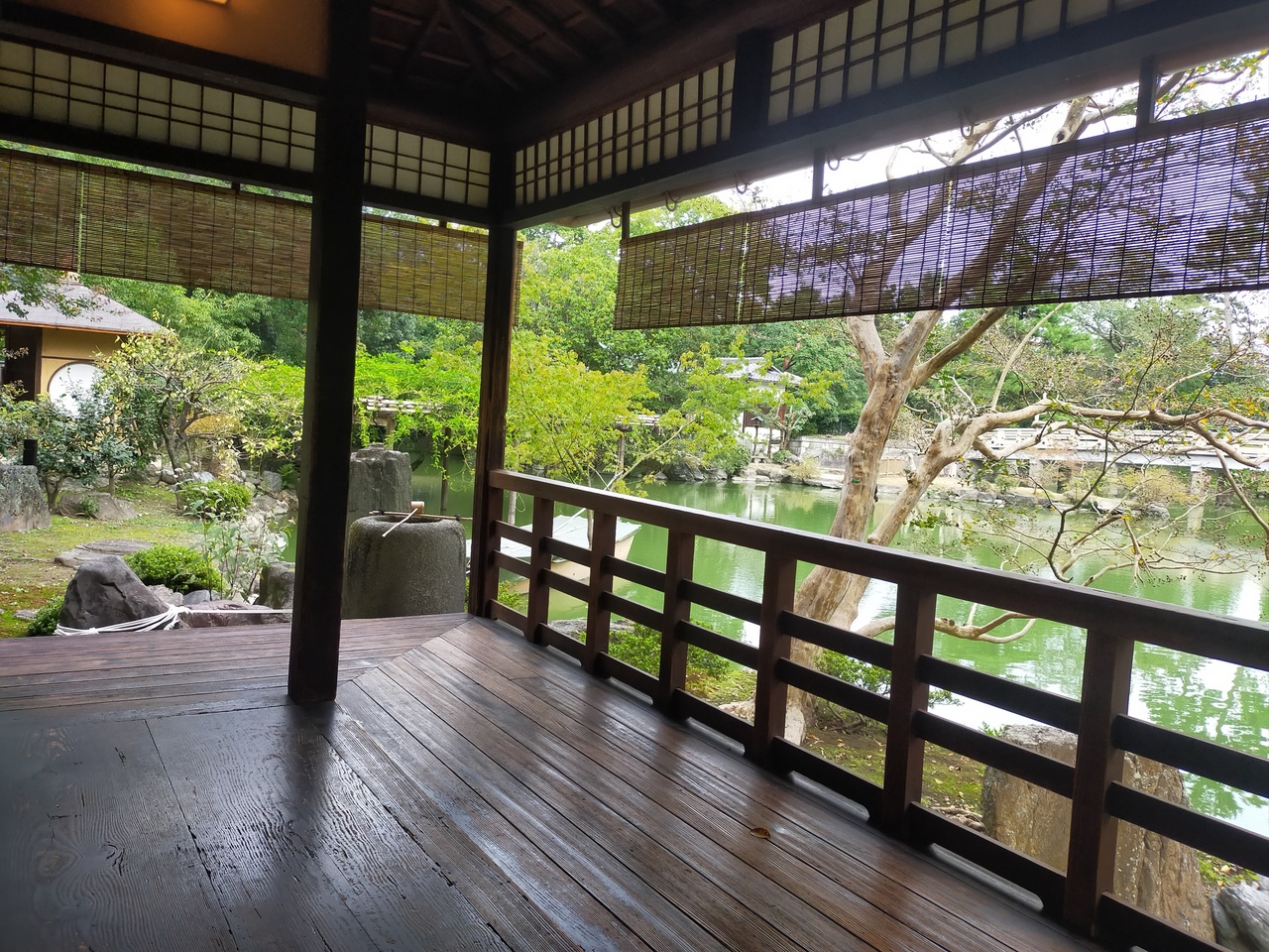 五摂家の1つ、九条家の茶室で、建築は江戸時代後期です。数奇屋風の建物となっており、丁子七宝の意匠や擬宝珠の付いた高欄、広縁と榑縁など見どころが沢山あります。解説の冊子も貰えるので、それを見ながら見学すると、より一層楽しめますね。2階に上がると眺めもまた違って、紅葉の時期などはとても綺麗なのではないかと思います。