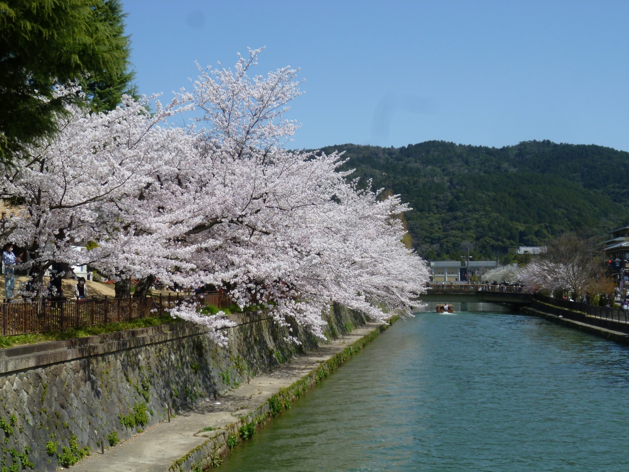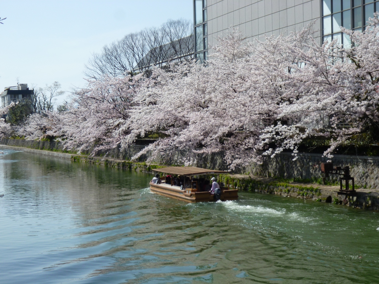 岡崎公園は、平安神宮の南側に広がる公園で京都市動物園・琵琶湖疏水・京都国立近代美術館などこのあたり一帯を指しています。平安神宮前の神宮道では様々な催しやバザーなどもよく開かれていて、市民が集う公園として利用されています。今回は岡崎公園の桜を見学するために訪れました。グラウンド・テニスコート周囲の桜を見学した後に疎水沿いを散策して楽しみました。この時期には岡崎桜回廊と呼ばれ、赤橋から望む疎水沿いの桜と、疎水を運行する十石舟などまさに桜一色の公園を楽しむことができました。