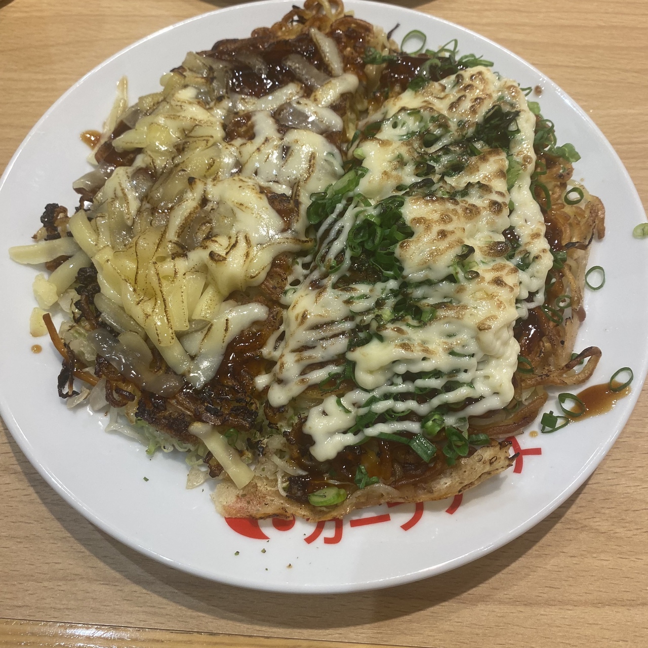アンテナショップが併設されており、府中焼きも楽しめるお店です。ランチは、ハーフセットもあり、2種類のメニューを楽しむことができて良かったです。肉たまそばチーズ炙りと炙りねぎまよのセットにしました。机上には追加のマヨネーズとソース、鰹節もありました。焼かれた状態で、お皿での提供となっておりましたが、おいしくいただけました。