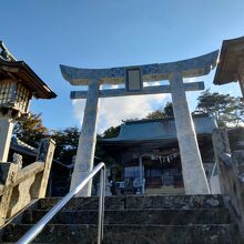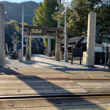 神社の境内を電車が走る珍しい神社には白磁で造られた磁器の鳥居や狛犬、燈籠がありました