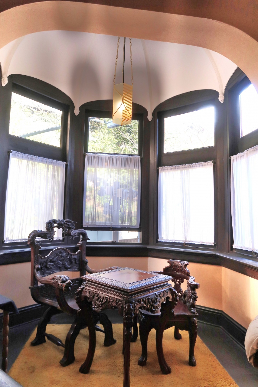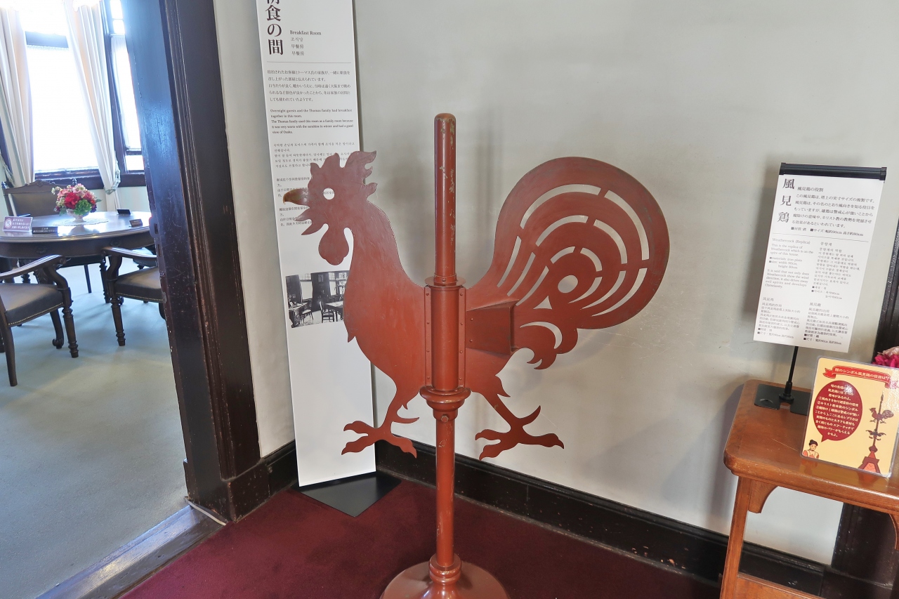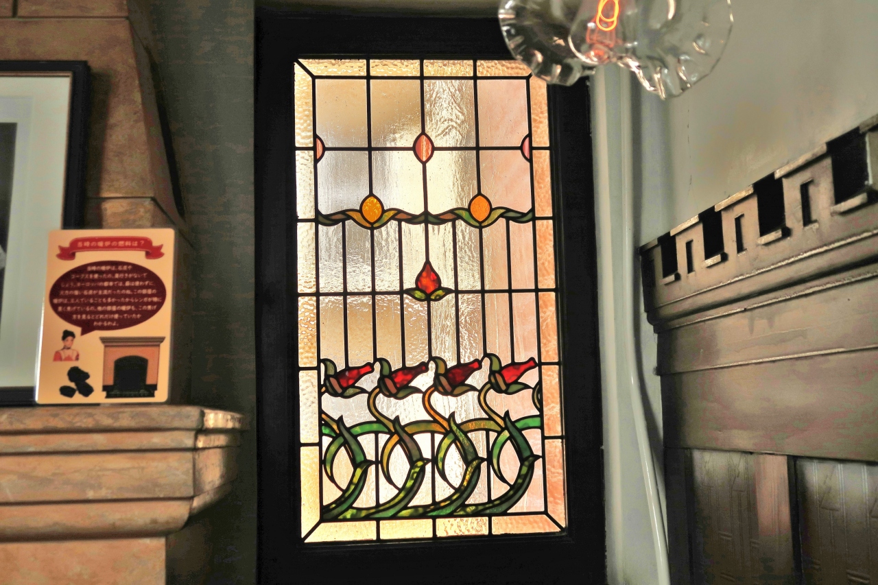 玄関入った右手に五角形のベイ・ウィンドーの談話室があり、ユーゲントシュティールの風刺画、こうもり傘を広げたデザインの照明と天井の組み合わせがユニークな部屋となっていました。ドイツ中世の古城の雰囲気の食堂には、ユーゲントシュティールのステンドグラス、地下の食堂からできあがった料理が運び上げられるリフト付きの家具までありました。北野を代表する異人館だけに、見所が多い邸宅でした。