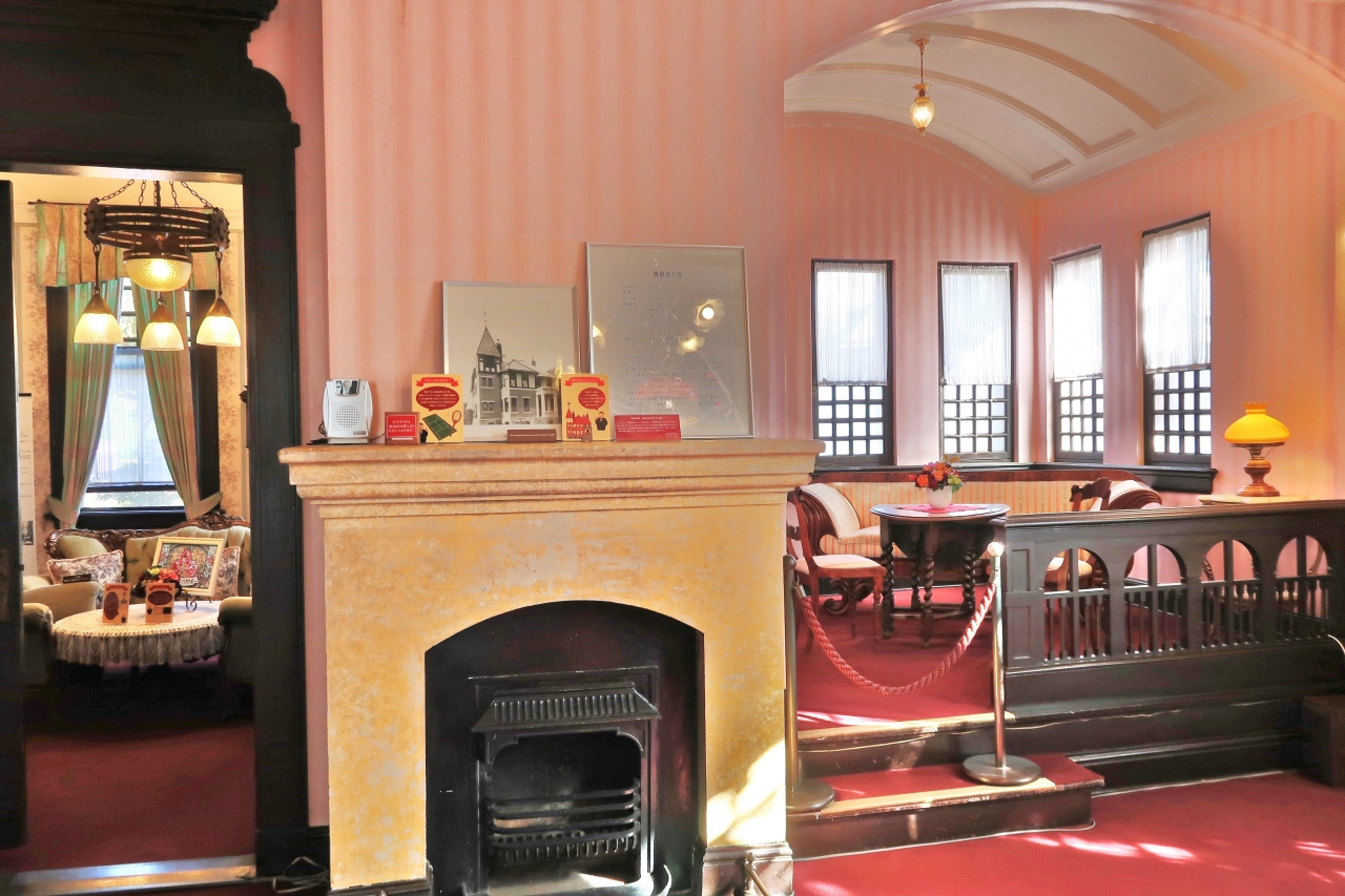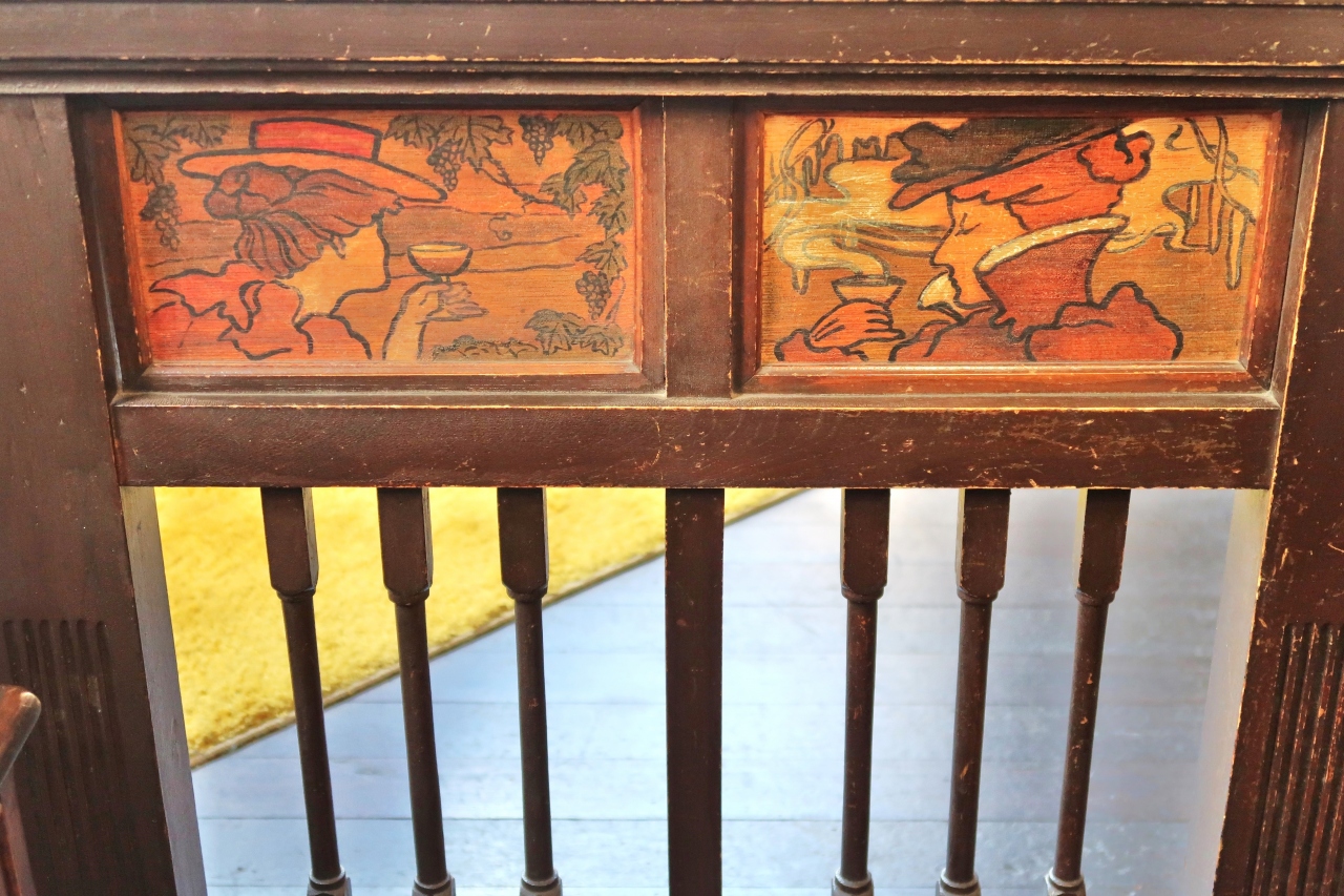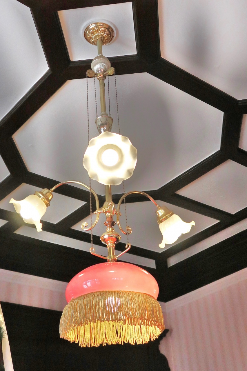 玄関入った右手に五角形のベイ・ウィンドーの談話室があり、ユーゲントシュティールの風刺画、こうもり傘を広げたデザインの照明と天井の組み合わせがユニークな部屋となっていました。ドイツ中世の古城の雰囲気の食堂には、ユーゲントシュティールのステンドグラス、地下の食堂からできあがった料理が運び上げられるリフト付きの家具までありました。北野を代表する異人館だけに、見所が多い邸宅でした。