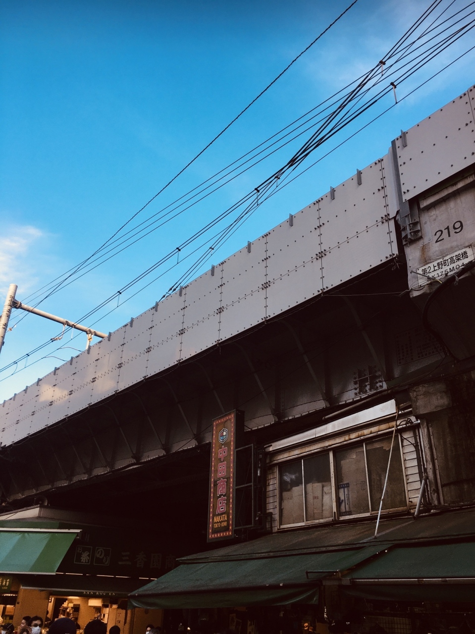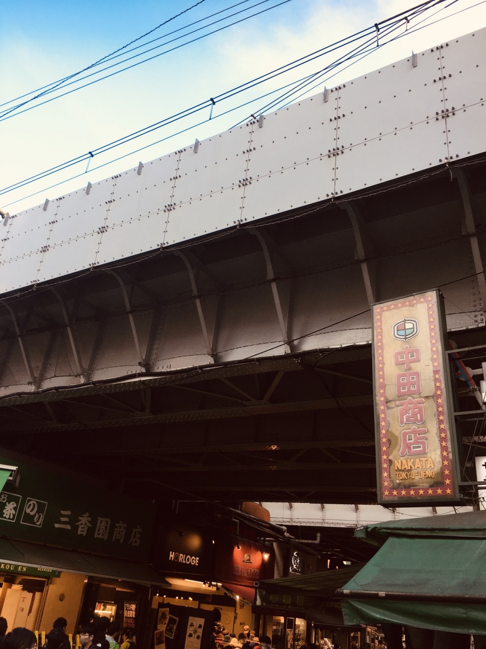 アメヤ横丁の中心部にあり、高架橋の下は広めの道路で飲食店や洋服屋等もあります。周辺は人でごった返し、橋の下には店の看板が目立っていました。橋の側面のは正方形の鉄板のようなものが連なっていてネジもたくさん見えました。