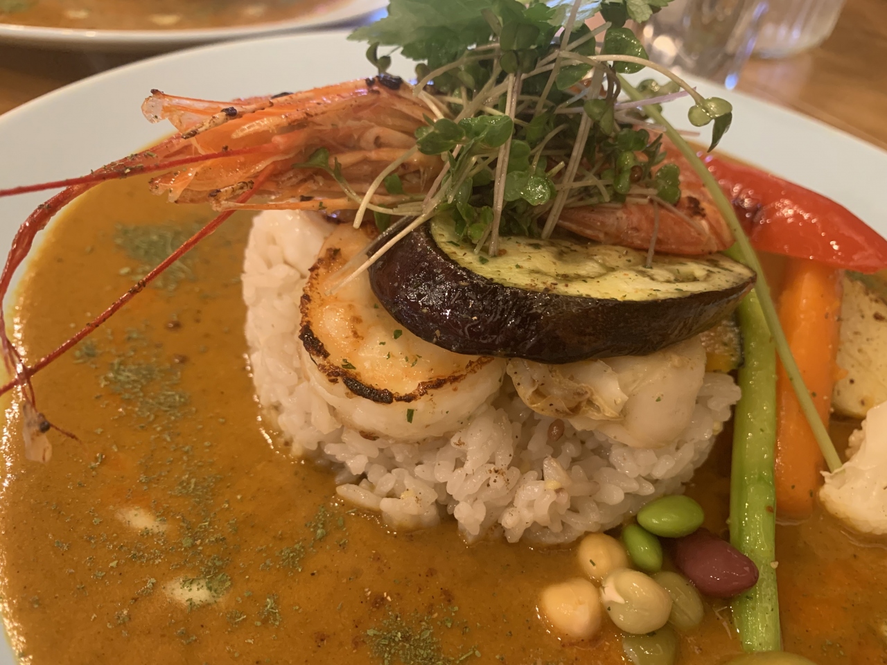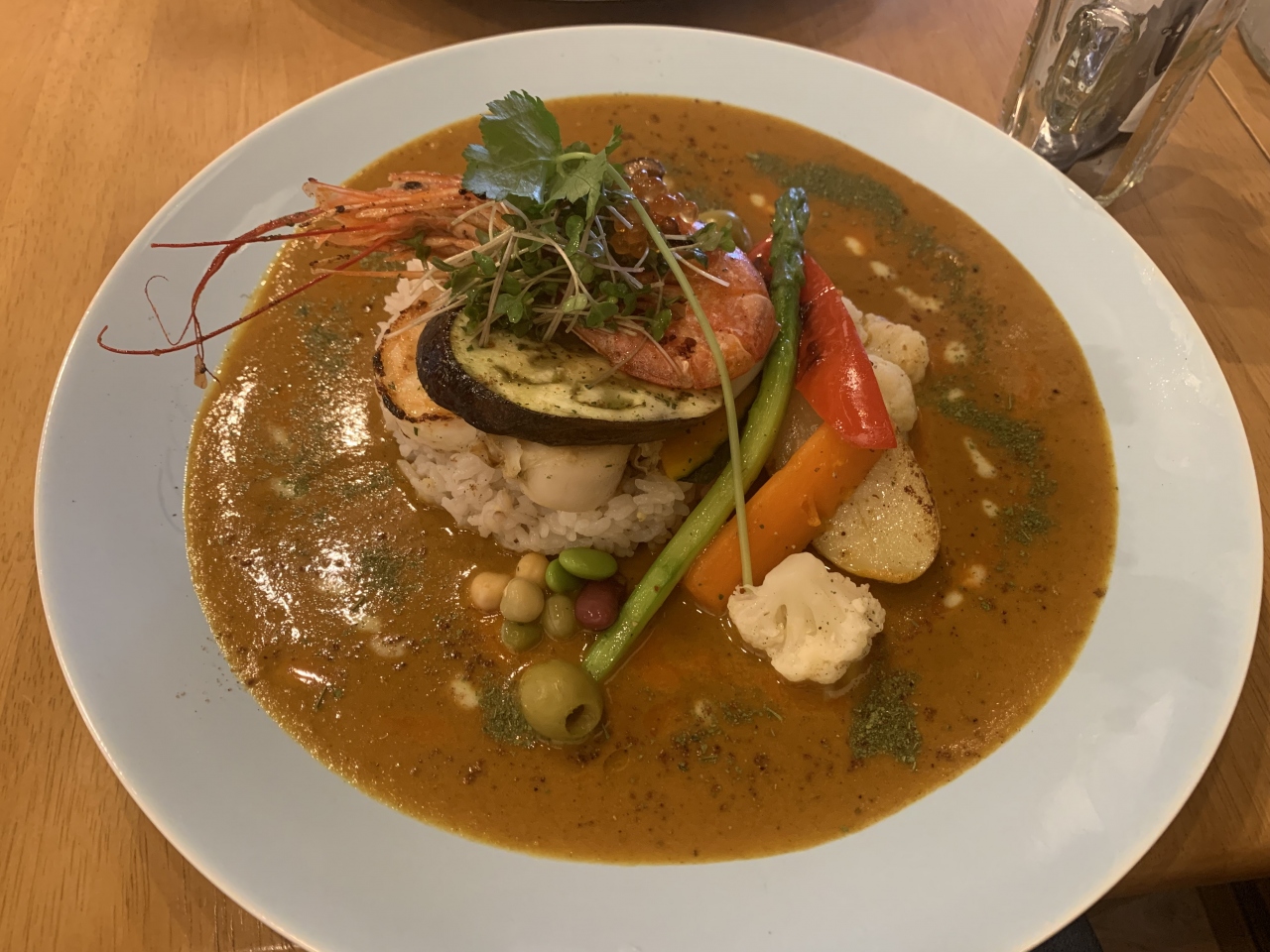 人気の店の様で、GW中ということもあり混んでいました。しばらく待って入店。テイクアウトの注文もかなり入っている模様。本日のカレーをオーダーしました。エビとホタテのソテーをあしらったカレー、見た目通り美味でした。デザートにフルーツサンドもいただきました。岡山市はマスカットなどのフルーツ産地としても有名。これも美味かった、ごちそうさまです。