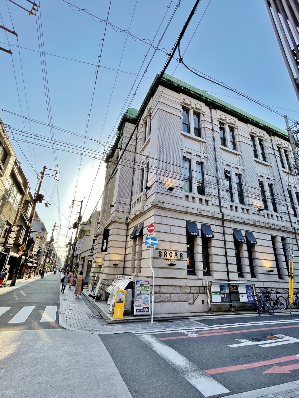三条通りにあるレトロビルのひとつです。大正時代、旧不動貯金銀行(現協和銀行)の京都支店として建てられました。1階が煉瓦造、2、3階が木骨煉瓦造で造られています。外観だけでなく内部の雰囲気も素敵で、若者向けファッションや雑貨のテナントが入っています。