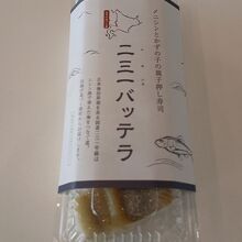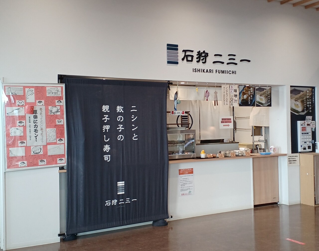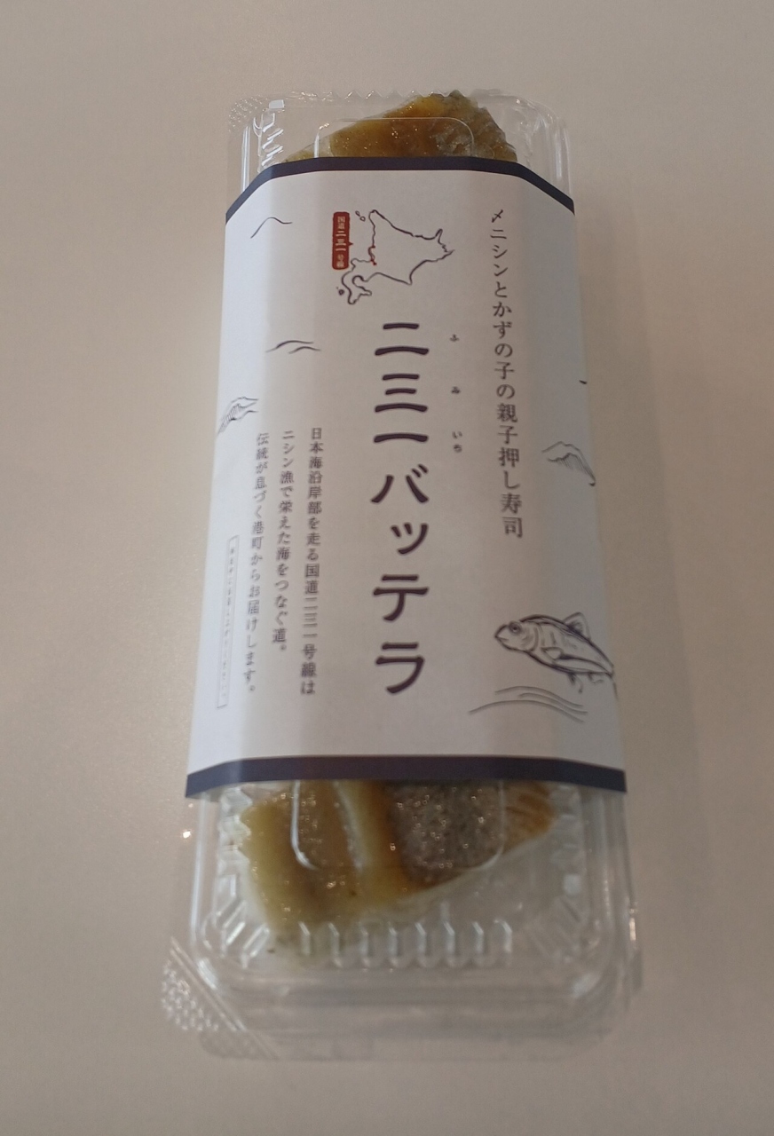 小腹が空いたので立ち寄った道の駅「石狩 あいろーど厚田」の2階あった石狩ニ三。1階からエスカレーターであがり、正面左手。ニシンと数の子のバッテラ(押し寿司)は初めて食べたが、白ごま入りのすし飯ともとても相性がよく美味しかった。