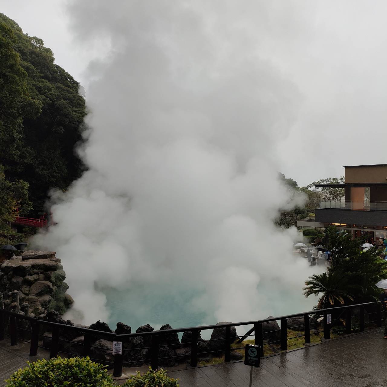湯気がモワモワとしているところから、ときおり見えるコバルトブルーの海地獄。とてもきれいだなと思いました。