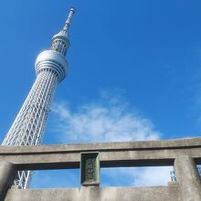 スカイツリーが背後にそびえる神社で、鳥居の下から見上げると、スカイツリーが視界に入り見事な景観だった。