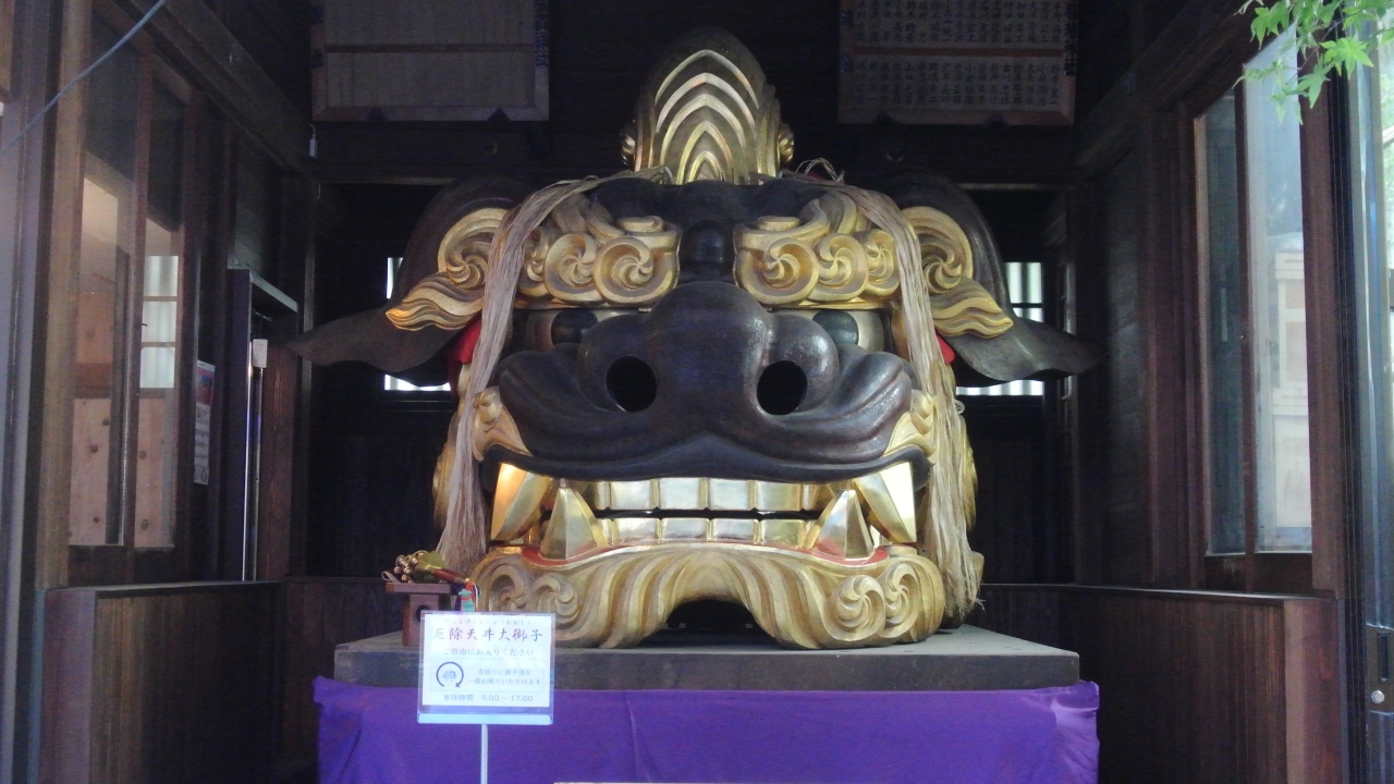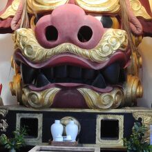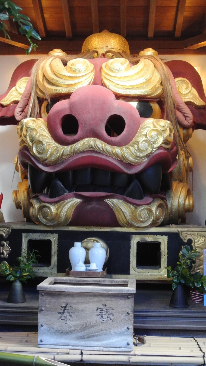 波除稲荷神社境内、社殿に向かって右側には「厄除天井大獅子」、左側には「お歯黒獅子」が安置されていました。どちらお巨大な獅子頭ですが、お歯黒獅子は、お歯黒をして顔も赤いので、雌なんでしょうね。波除神社のみどころの一つだと思います。