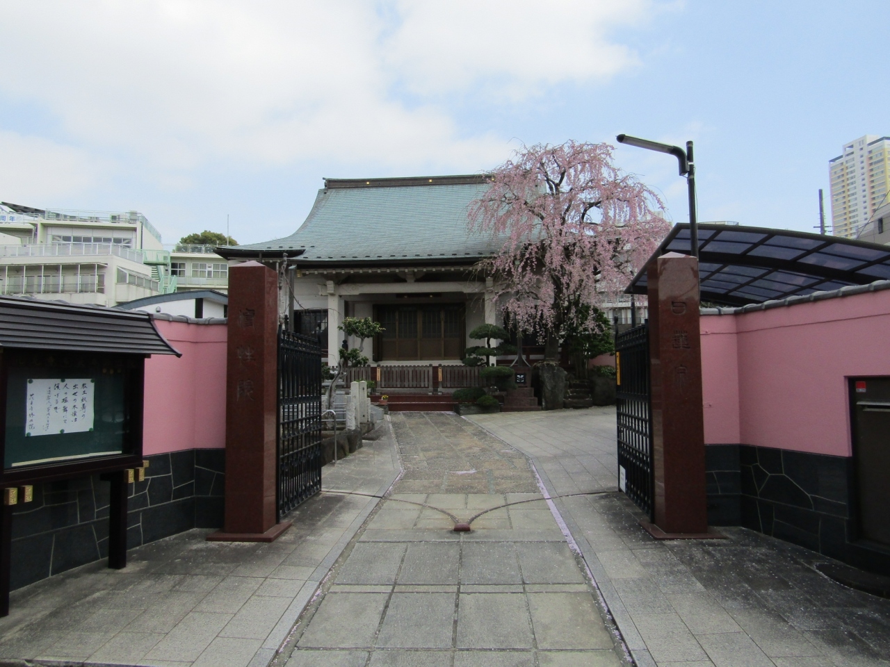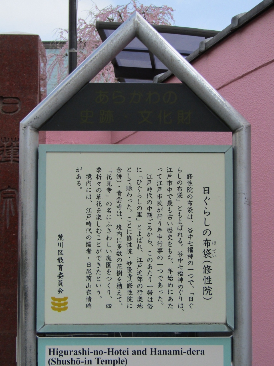 お寺の外壁のピンク色に違和感を覚えながら入口へ向うと、説明板に「谷中七福神の布袋が安置され、境内に多数の花樹が植えられ花見寺と呼ばれている」とありました。