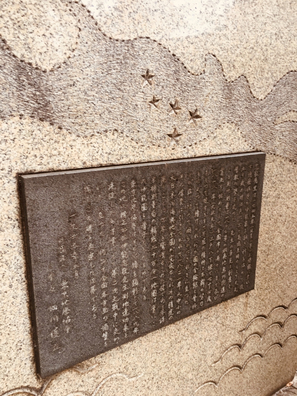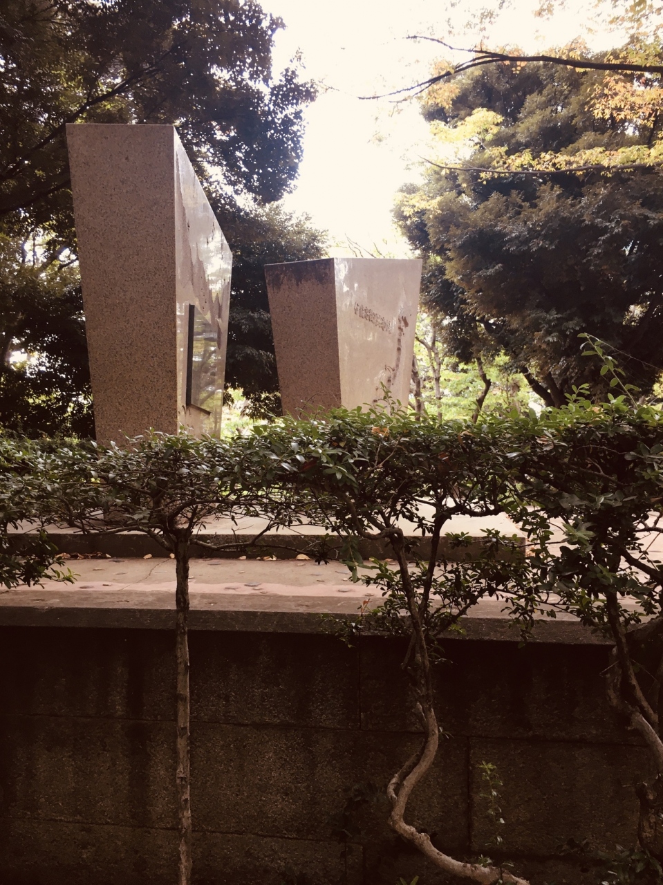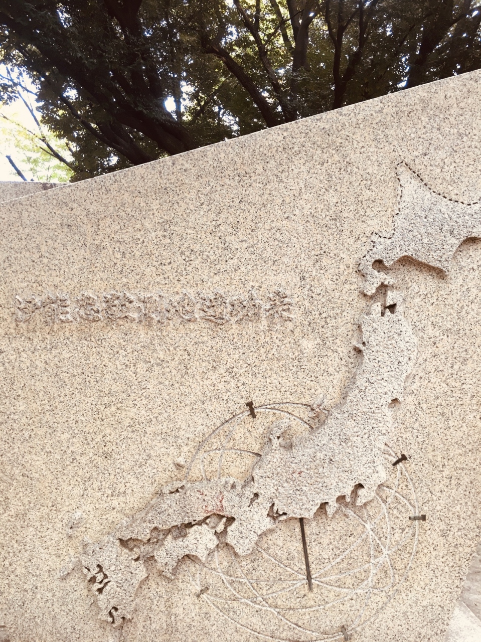 階段を上がり高台にあり、前面は空間になっていて後方には木々が立っていました。日本地図の石碑があり、後ろには文字が記載した石碑があります。石の土台の上に建っていて大きな木々があるせいか暗めの雰囲気の場所でした。
