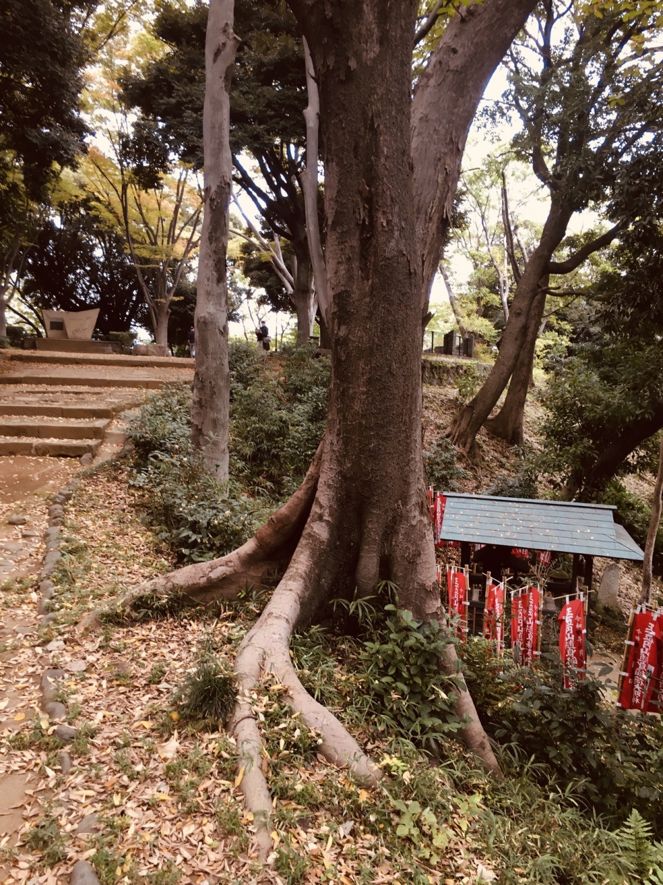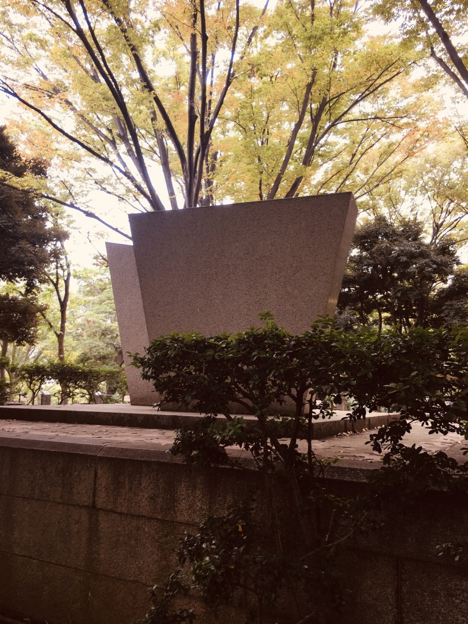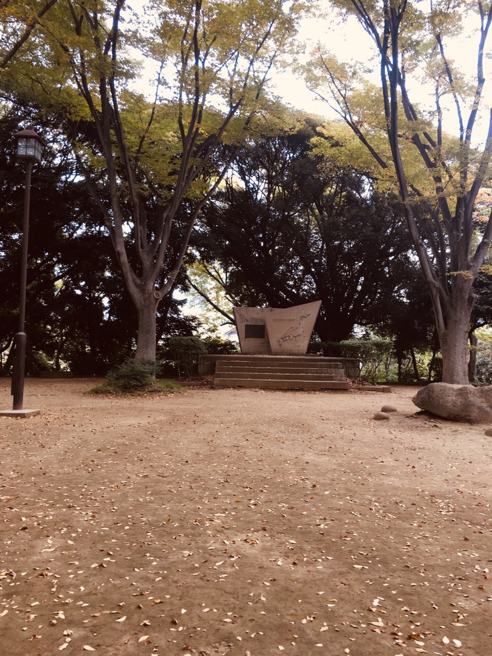 階段を上がり高台にあり、前面は空間になっていて後方には木々が立っていました。日本地図の石碑があり、後ろには文字が記載した石碑があります。石の土台の上に建っていて大きな木々があるせいか暗めの雰囲気の場所でした。