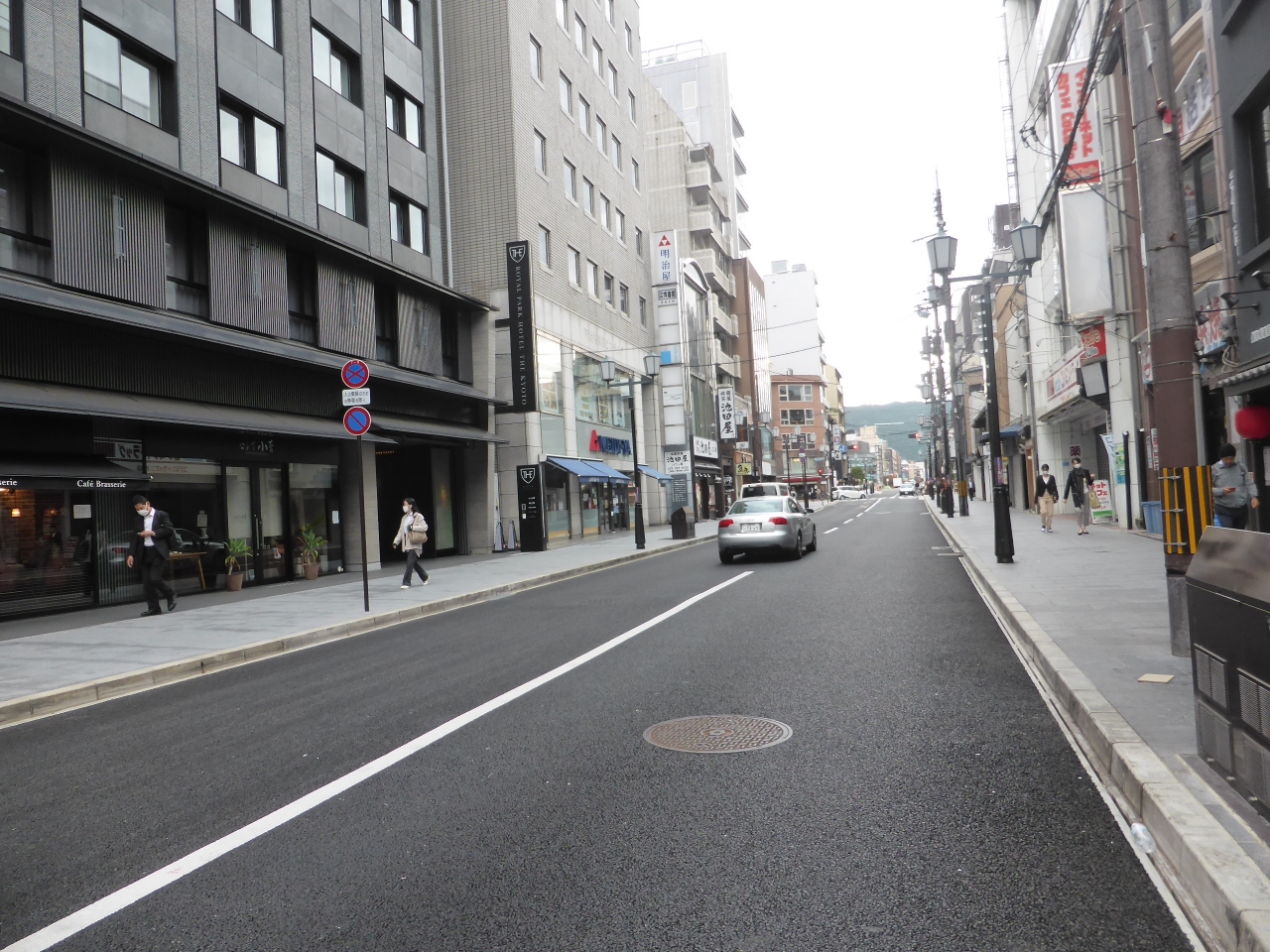 京都市街地の中央を東西に通ずる街路の一つで 平安京の三条大路に該当する。 鴨川に架かる三条大橋は東海道五十三次の終点です。三条大橋の西詰めには十返舎一九の東海道中膝栗毛に登場する弥次喜多像が建っています。京の表玄関となり宿場町としても発展してきた。現在は多くの飲食店が立ち並び多くの人が行き交っています。歩道も広くなり歩きやすい。