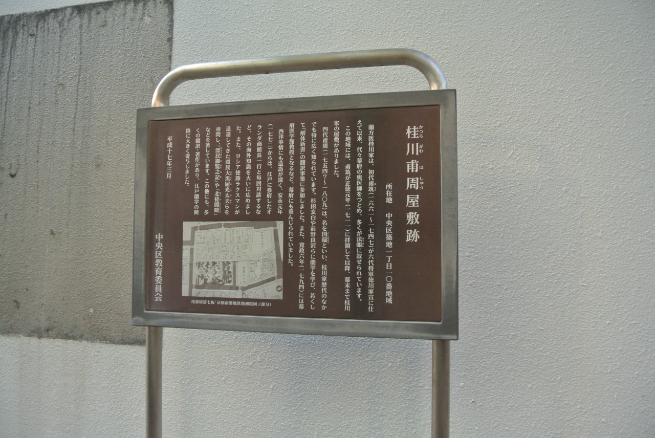 ビルの横に江戸時代の絵図入りの説明板が設置されていました。桂川穂周は大黒屋光太夫の聴取を行った人物としては知っていましたが、解体新書の翻訳にも携わっていたことはこの説明板で初めて知りました。わざわざこれだけを目指して行くとういよりは、近くに行かれた時に立ち寄ってみてはいかがでしょうか。