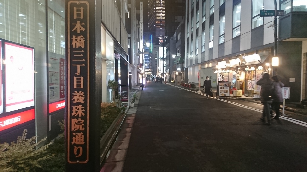 東京駅八重洲口駅前から昭和通りまで続く、東西に結ぶ通りの名前です。養珠院とは徳川家康の側室・お万の方の院号で、お万の方を祀ってある於満稲荷神社が有る事から名付けられたそうです。東京駅近くには飲食店が並んでいますが、それ以外の部分は特に特徴の無い通りです。
