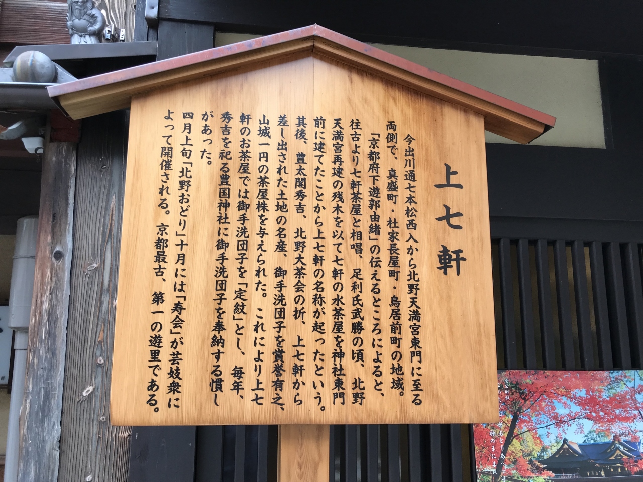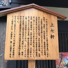 上七軒は、北野天満宮の東隣にある花街で、最も歴史ある花街です。規模は小さいですが、通り沿いはきれいによく整備されています。電線も地下化されているので昔ながらの雰囲気を楽しむことできる場所です。かつては上京区真盛から社家長屋町にまたがる地域が花街だったそうです。人が多い祇園よりも雰囲気がいい場所だと思います。