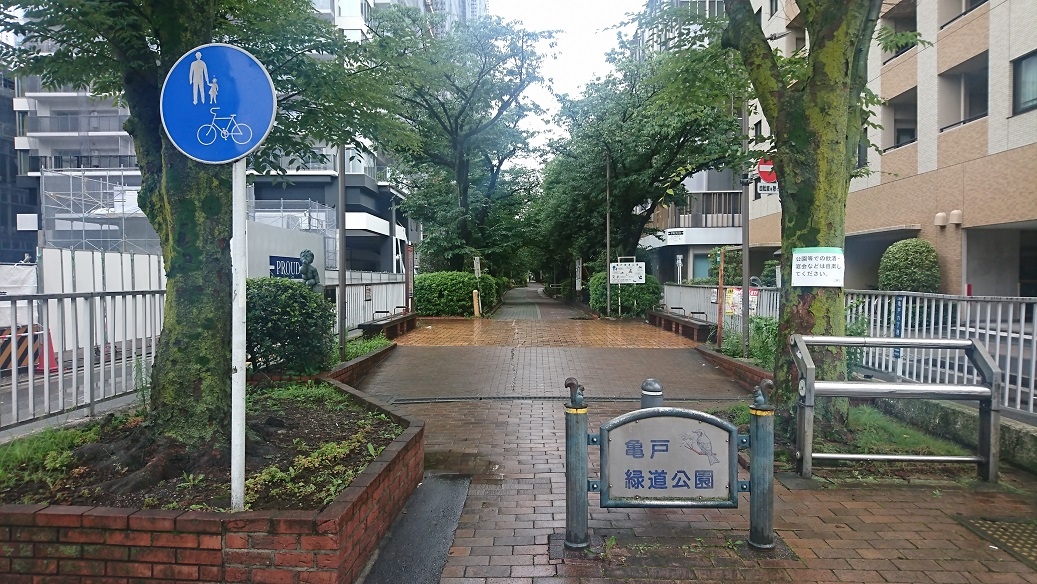 江東区の亀戸駅南口から西大島まで続く緑道です。首都高速道路の北側が亀戸緑道公園で、南側は大島緑道公園という名前になっています。以前は都電が走っていた場所を緑道として整備した様です。緑道にはソメイヨシノやツツジが植えてあり、花見も楽しめる素敵な緑道だと思います。