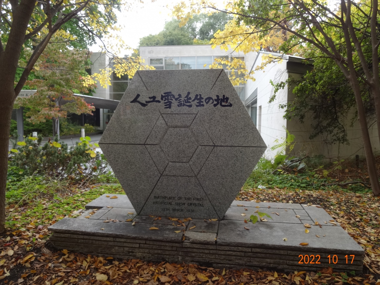 人工雪の結晶が世界で初めて誕生した北大の常時低温研究室跡(現在の理学部と工学部の中間)に建てられたものだそうです。