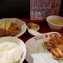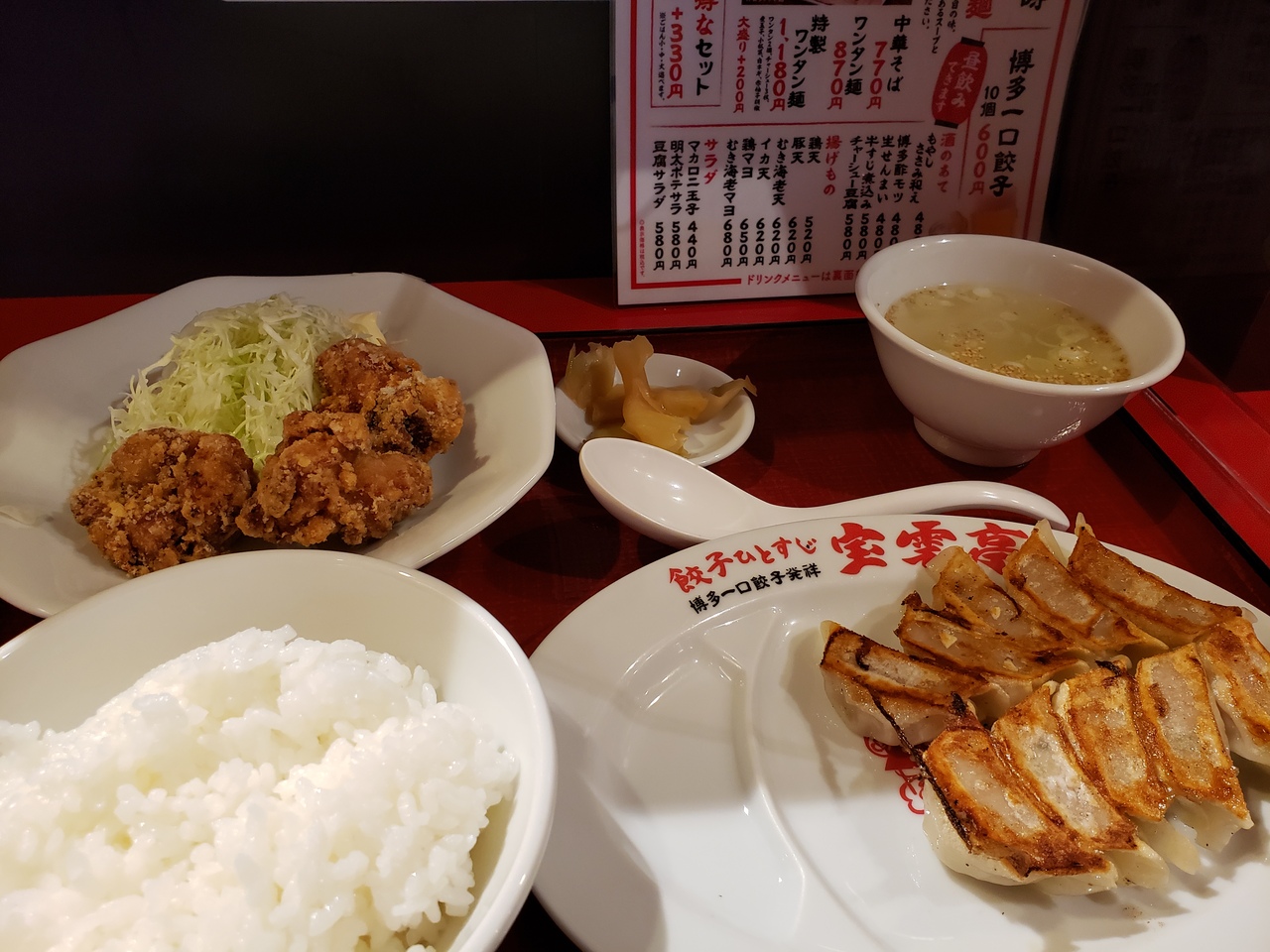お昼が11時から17時までとながめなので、観光客には嬉しい。ランチは名物の博多一口餃子10個にニラ玉か唐揚げ3つの餃子定食かスープ餃子定食の二種類。餃子は一口サイズでおつまみにもぴったり。赤柚子胡椒でお好みの味にしながら楽しめます。