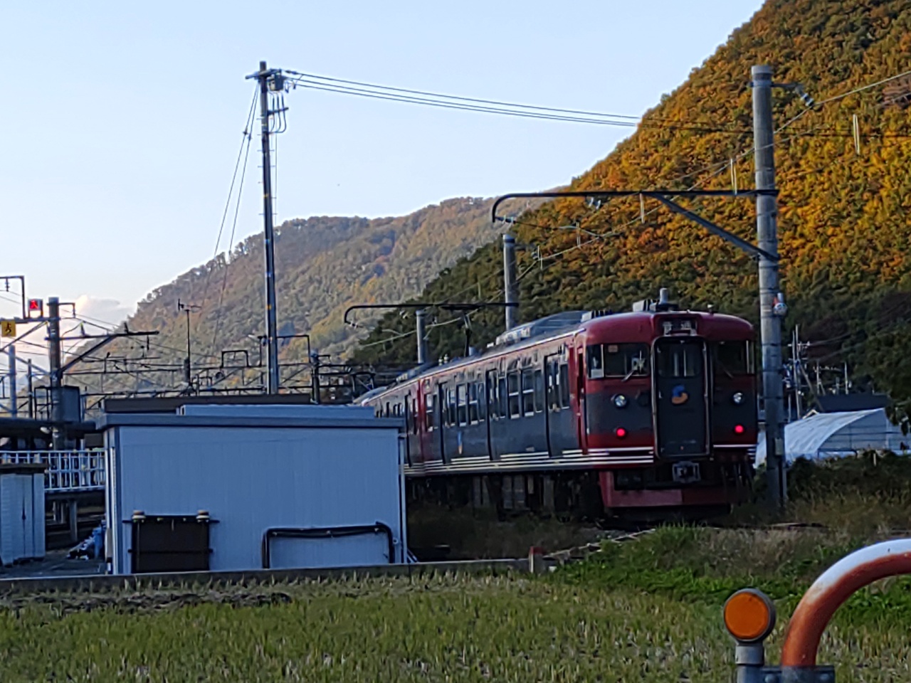 先頭が赤い電車で、軽井沢駅と長野駅を結んでいます。割と速い感覚を覚えました。キティランドの一番上の方から景色を見ていてる時にも、電車の音が大きく聞こえてきました。山々でこだまになってくるのか、とても大きい音にびっくりしました。