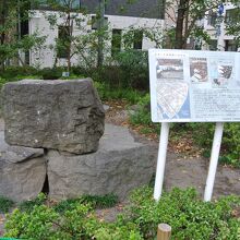 護岸のための石垣石が、その名も越前堀公園に野外展示してあります。越前堀公園も越前藩の屋敷の堀部分に当たるようですが、この石そのものは越前堀の別の場所で見つかったものです。写真や越前堀・越前藩の屋敷の絵図入りの詳しい説明書きが石垣石の前にきちんと設置されていました。