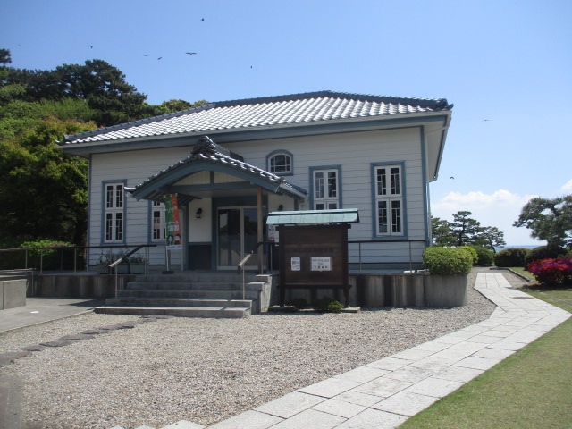 こちらの広場からは、竹島の全景が見えます。つまり竹島のビューポイントで、のんびり見るのにいい場所です。あと、平安時代後期から鎌倉時代の初期の公家であり、歌人の藤原俊成の像があります。あと、海辺の文学記念館は、この海沿いにぴったりの素敵な洋館です。