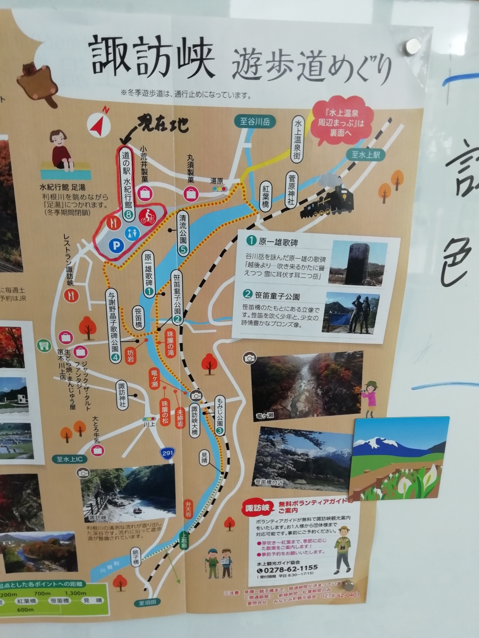 水上の道の駅から諏訪峡への散歩コースがありました。訪問時は川沿いを工事していたので、う回路を利用しました。橋を渡って一回りで1時間かからないくらいでしょうか。紅葉がきれいで、ドライブの途中の休憩にはいいと思います。