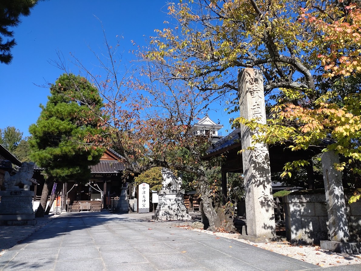 中津城の隣にある神社です。大神宮という名前ですが、神社が広いわけではなく駐車場が広かったです。拝殿にお参りするときに気づいたのは、灯籠のようにみえる構造物の上部が大砲の砲弾であること。平和を祈りました。