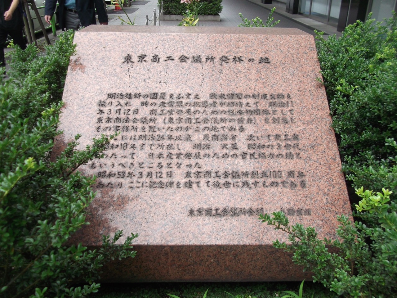 地下鉄東銀座駅から歩いて5分ほど、新橋演舞場と銀中通りを挟んで向かいにあるビルの一角にこの石碑がありました。明治11年に現在の東京商工会議所の前身がこの地に事務所を置いたのだそうです。石碑は創立100周年を記念して昭和53年に建てられたもので、日本の産業発展への貢献を後世に伝えています。