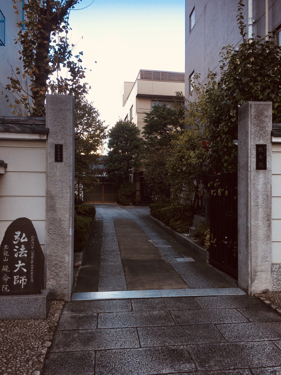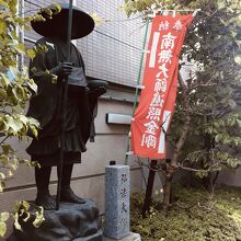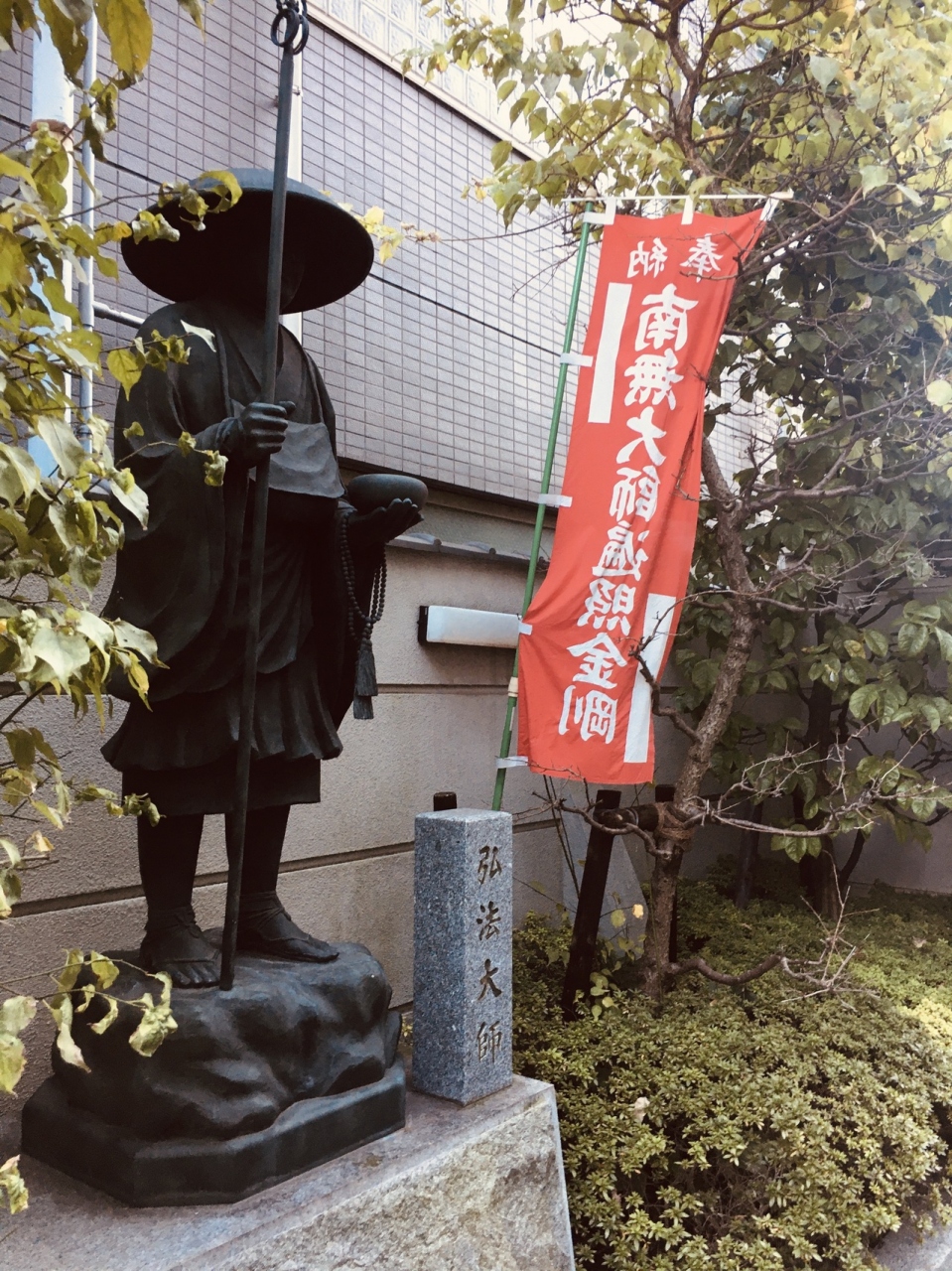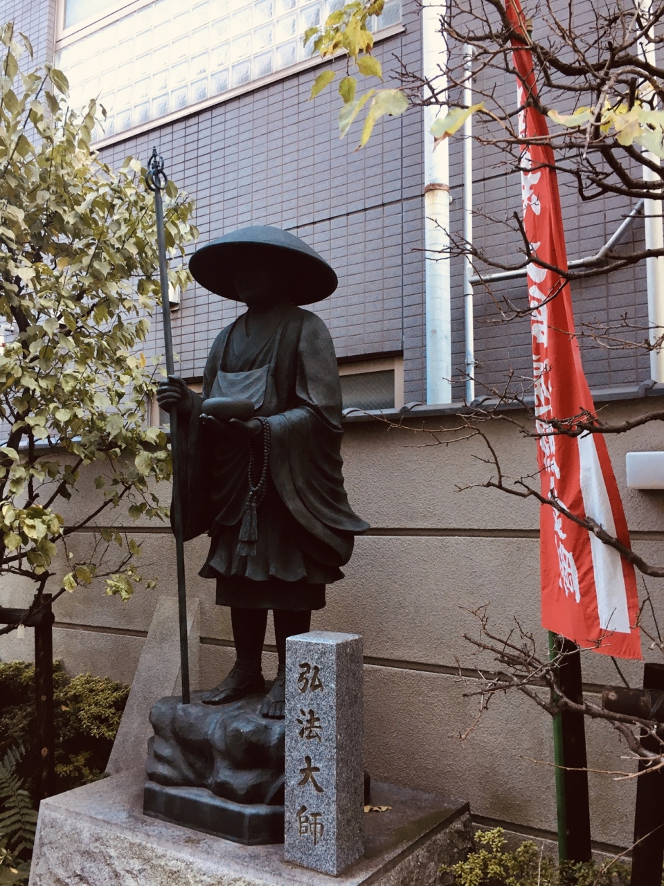 白い塀で、門前には弘法大師と書いた石碑があります。境内に入り一直線に伸びた石の道を進むと左側に弘法大師像があり菅笠を深く被っているため顔の表情は分かりませんでした。本堂前には賽銭箱もなく、大師像以外は見どころはないです。