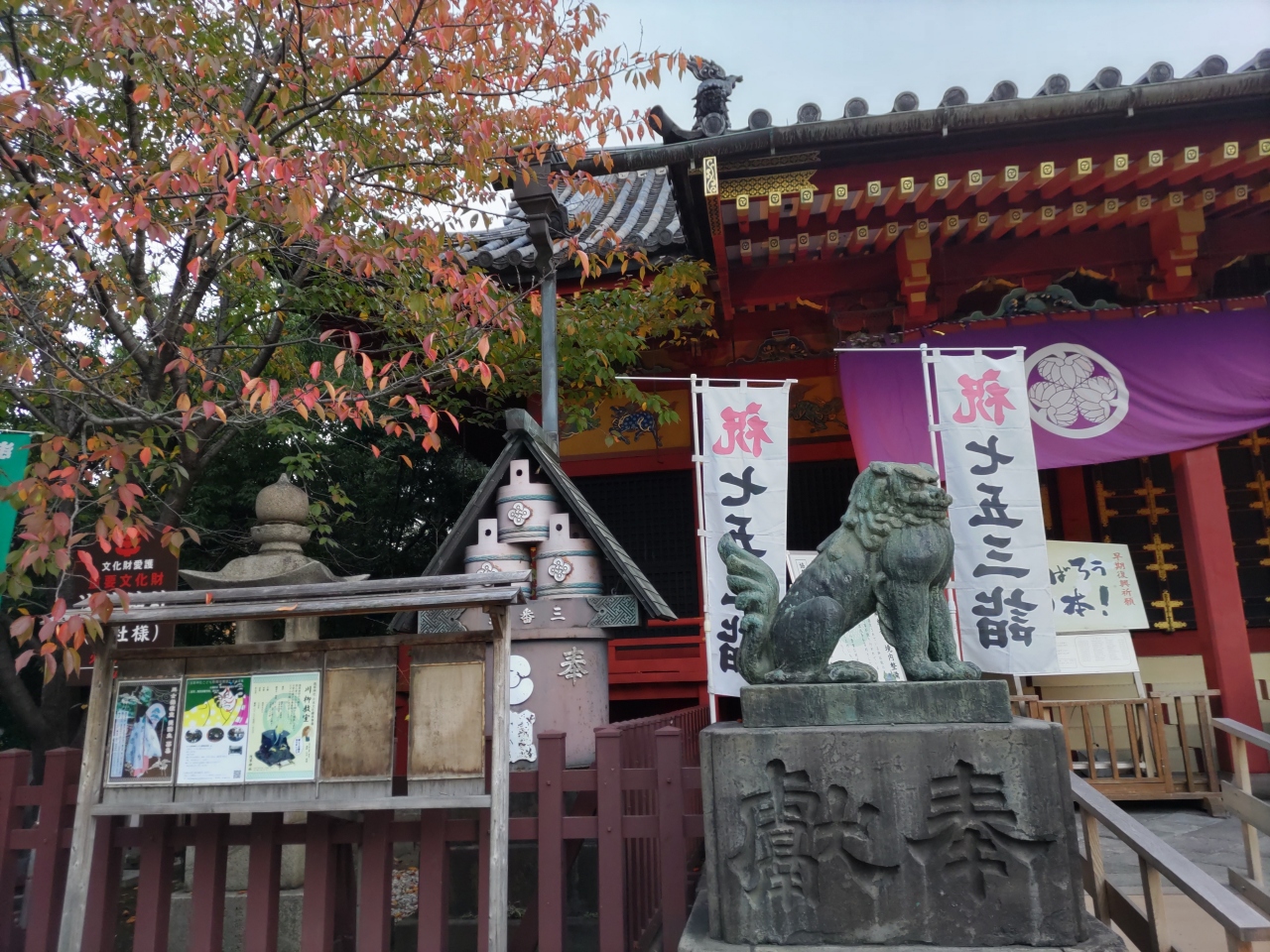 浅草に宿泊したので朝参拝にいきました。浅草寺のお隣でちょっとひっそりした感じがあります。境内、すこし紅葉した木々がありました。10/31にお参りしたので、七五三詣の旗などがあり、もうすぐ着物をきたお子さんたちでにぎやかになるのかもしれません。
